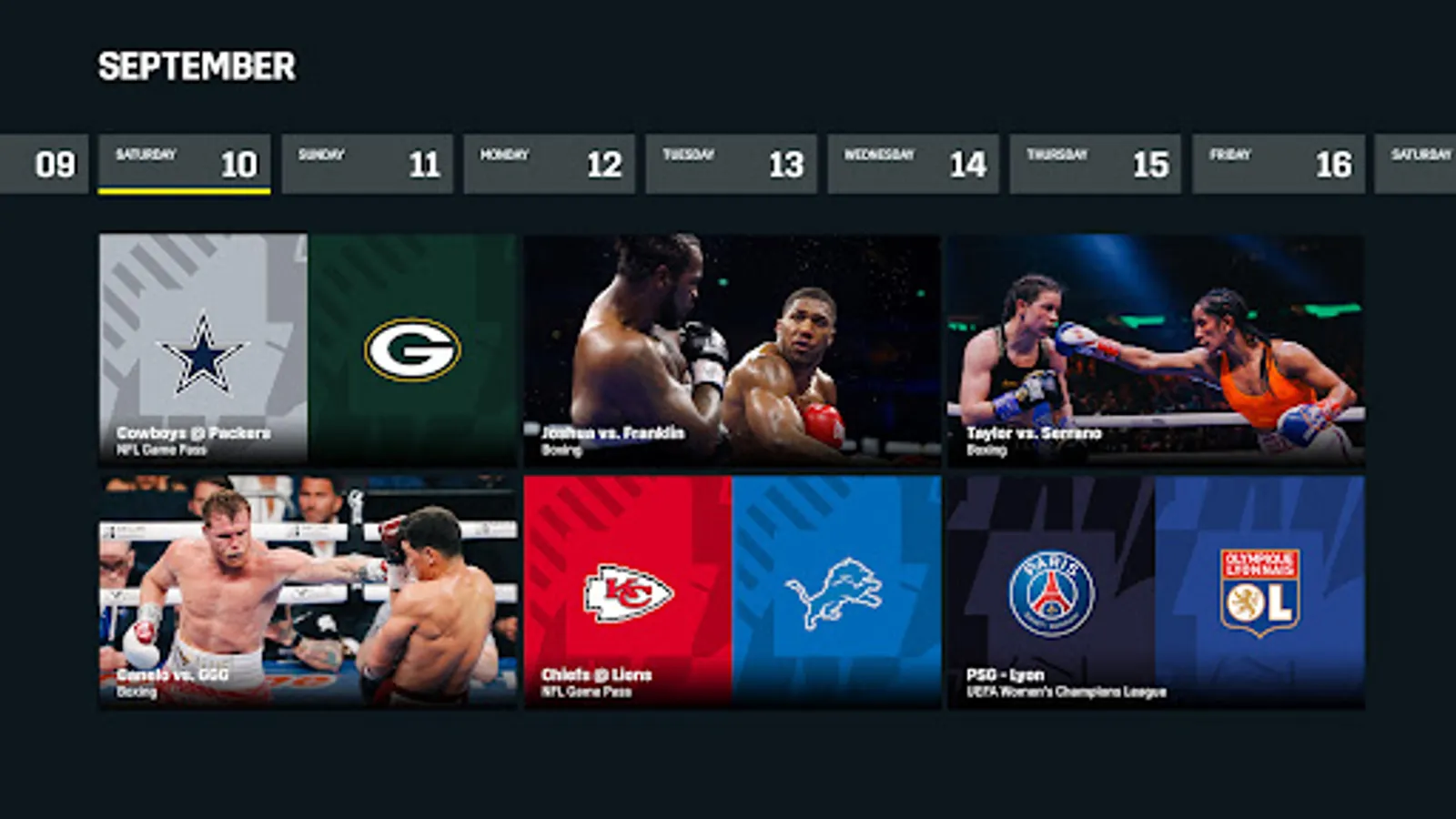 • Highlights covering UEFA Women’s Champions League soccer (UWCL) and boxing content.