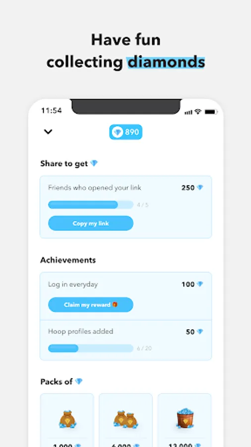 You can earn diamonds every day on Hoop. Use them to send friend requests, see the previous profile again or customize your own profile. There are many ways to earn diamonds: