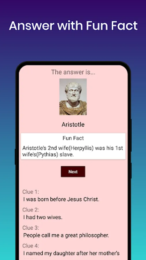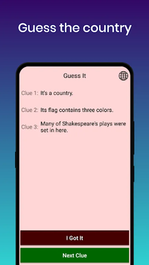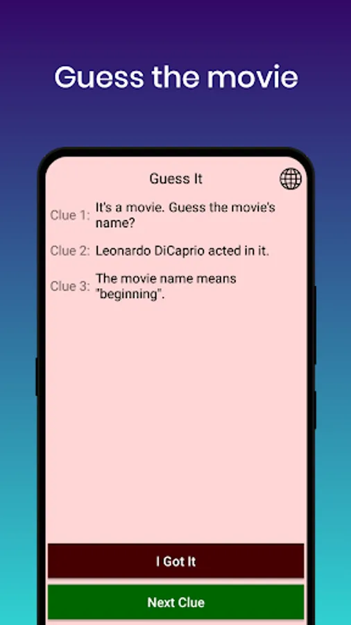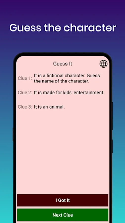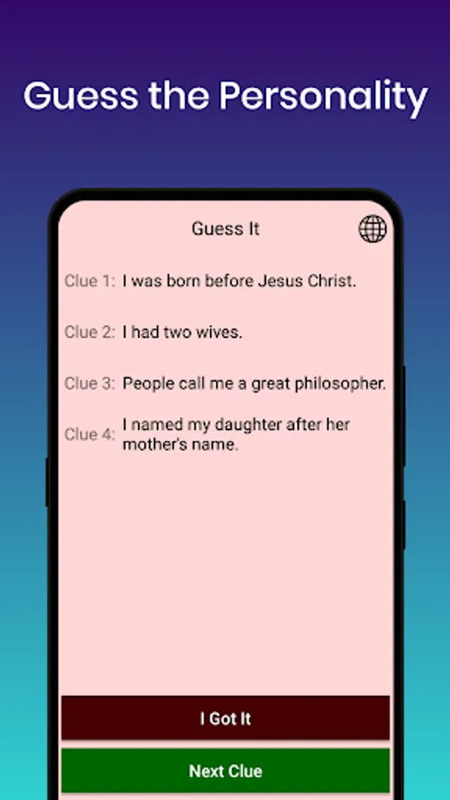 GuessIt is the ultimate trivia game that challenges your knowledge and problem-solving skills. In GuessIt, you'll get clues one by one and have to guess the answer. The clues can be about a person, thing, city, or any other topic.