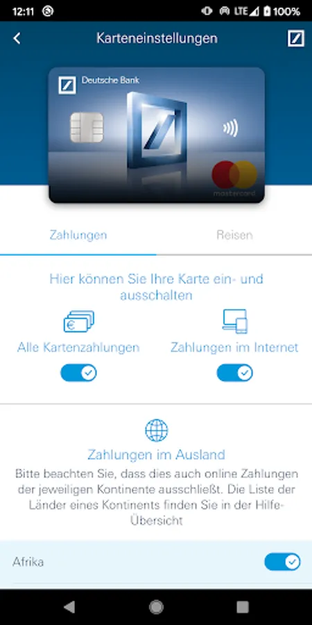 - Activate or deactivate your Deutsche Bank MasterCard with one click, differentiated and individually according to e.g. B. Payments on the Internet or abroad.