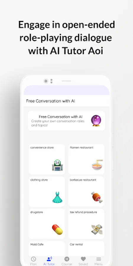 (1) Free Conversation: Aoi, equipped with ChatGPT and optimized for Japanese, can engage in role-playing conversations with learners in various scenarios, ensuring you excel in real-life Japanese communication.