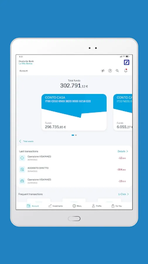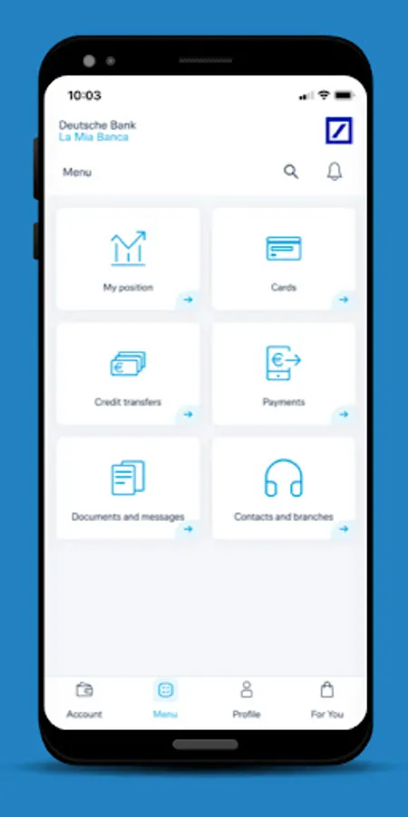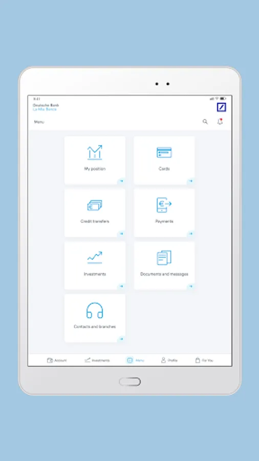 La Mia Banca is the official app of the Deutsche Bank Italia Group dedicated to account holders and holders of db contocarta, to manage their accounts and easily carry out transactions via smartphone. To log in, use the Deutsche Bank credentials (email and password) and the token you have chosen.