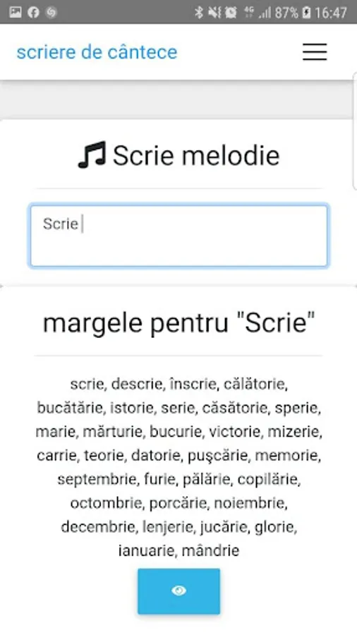 The application allows you to write and save your songs automatically. When at any time, you will be presented with a variety of rhymes for the last word you wrote.