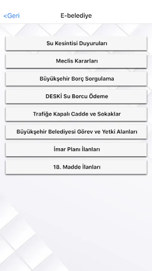 * Water Deduction Announcements, DESKİ Water Debt Payments, Pedestrian Streets and Streets, Metropolitan Municipality Duty and Jurisdiction Areas, Development Plan Announcements, Article 18 Ads