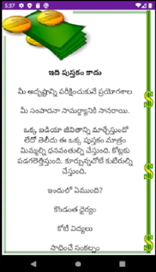 Exclusively designed for the Money earning aspirants with lots of practical ideas & Money earning tips. You can explore bundle of motivational topics & tips in this app. This e book will break down all your fears and make you empowered with lots of Money earning ideas & tips.
