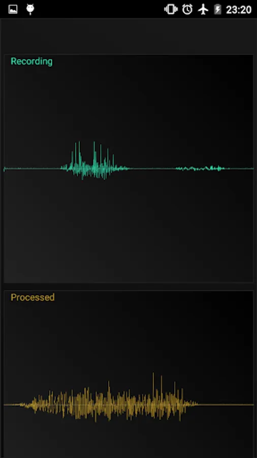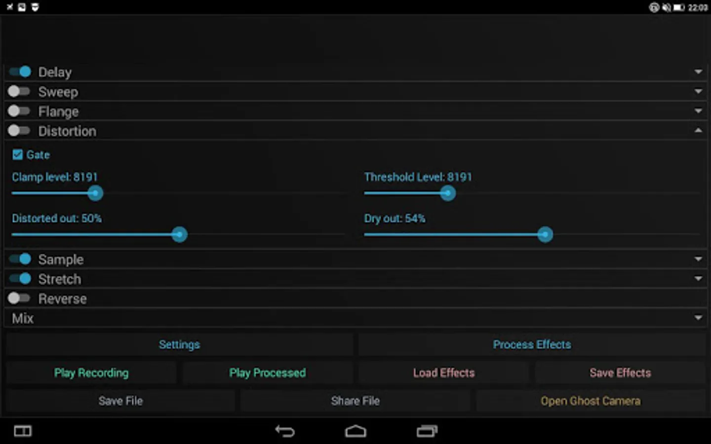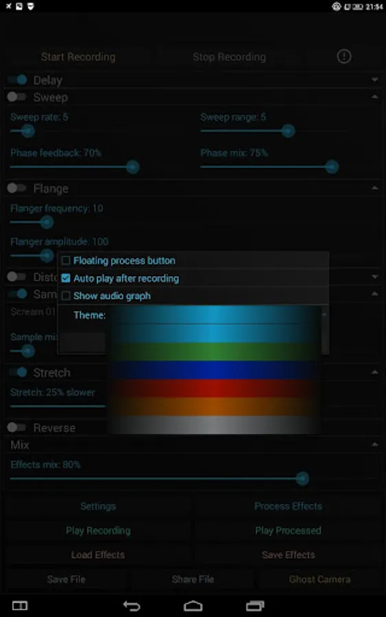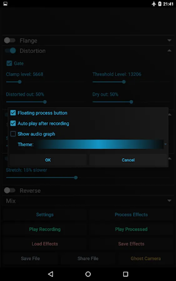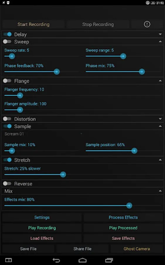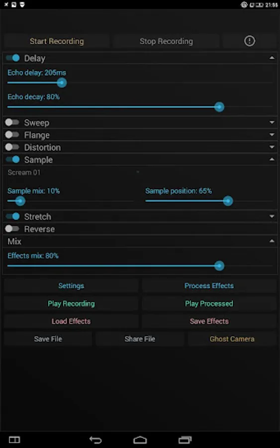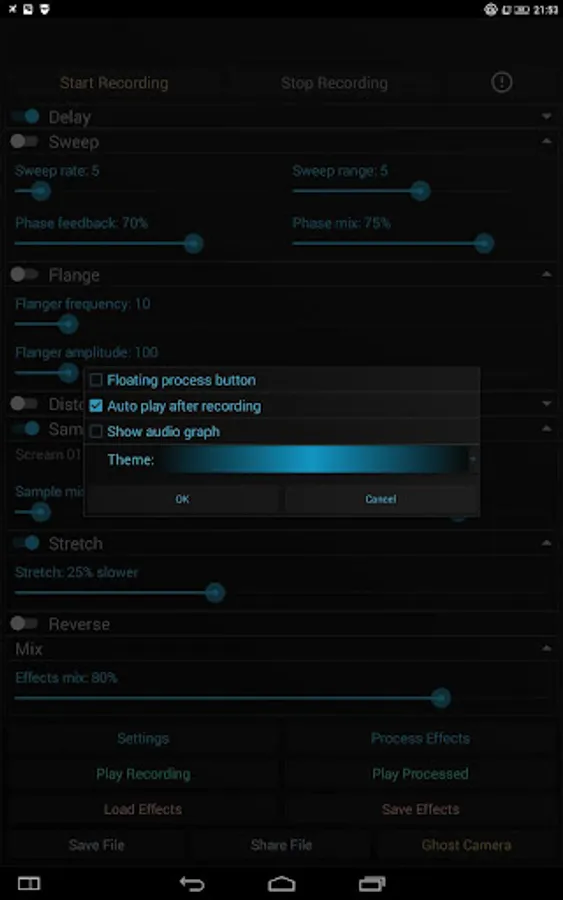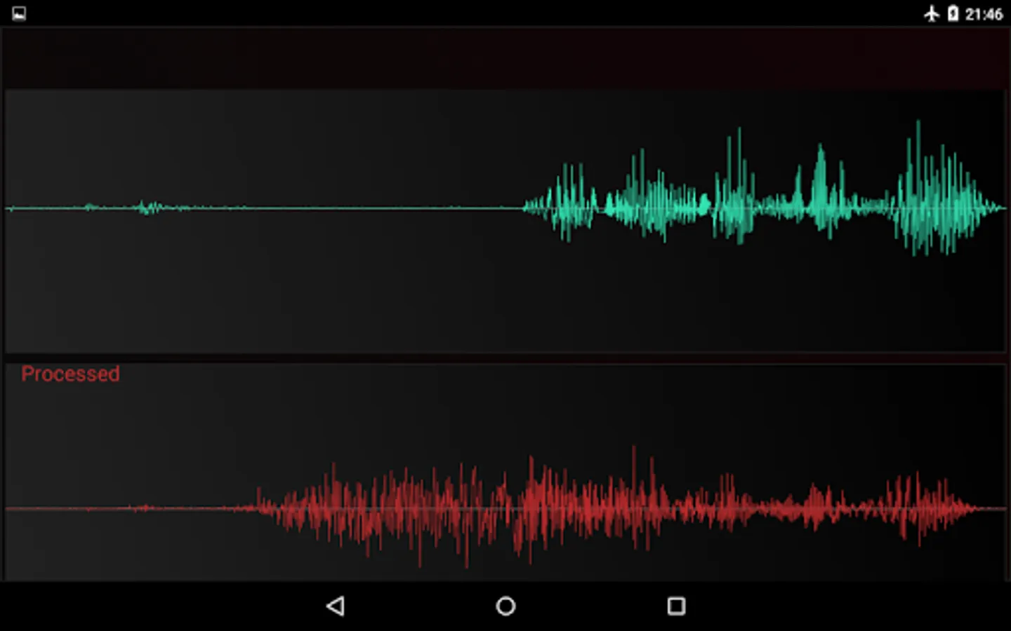 The app has default effects settings which can be changed and saved. You can also display an audio graph for the original recording and the processed file.