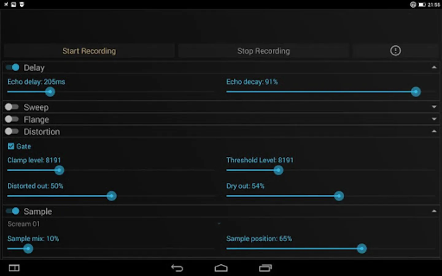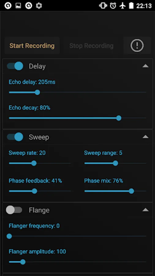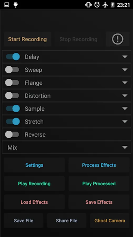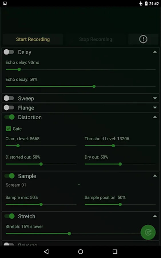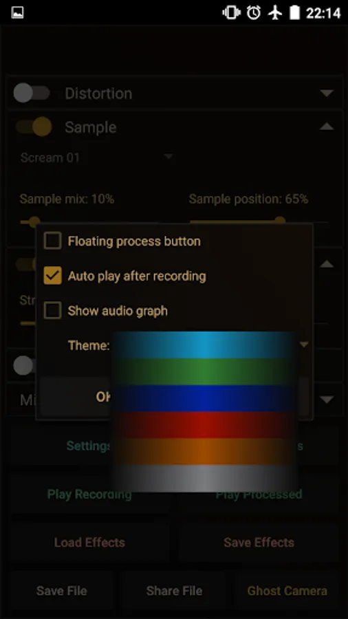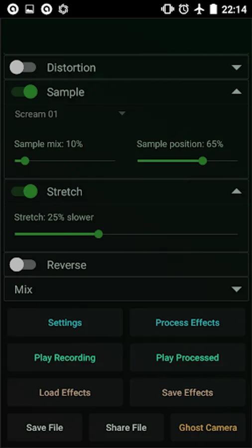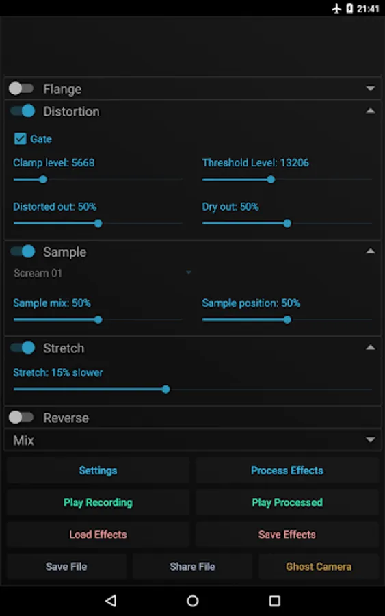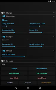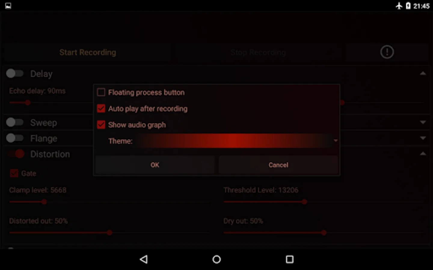 The app has default effects settings which can be changed and saved. You can also display an audio graph for the original recording and the processed file.