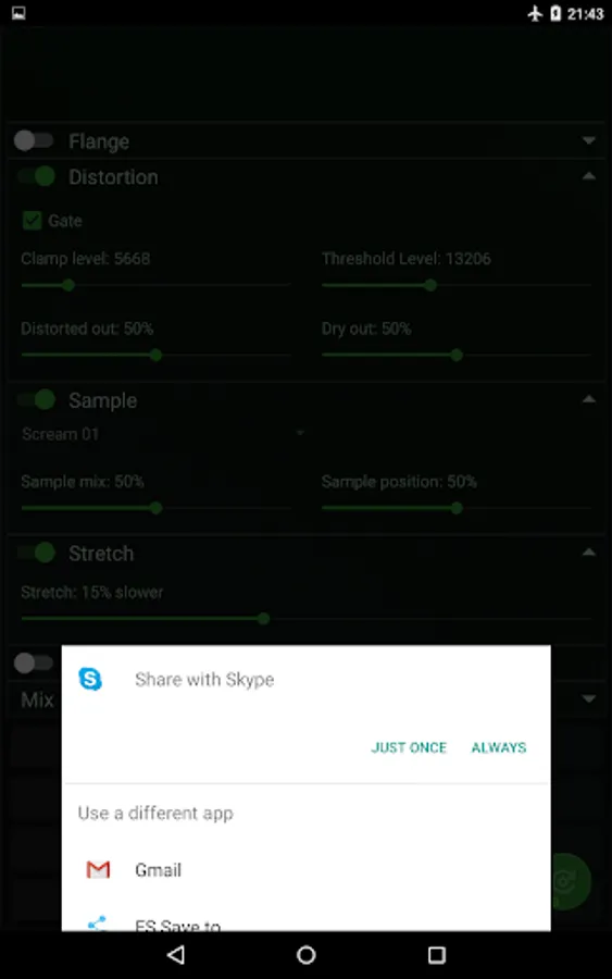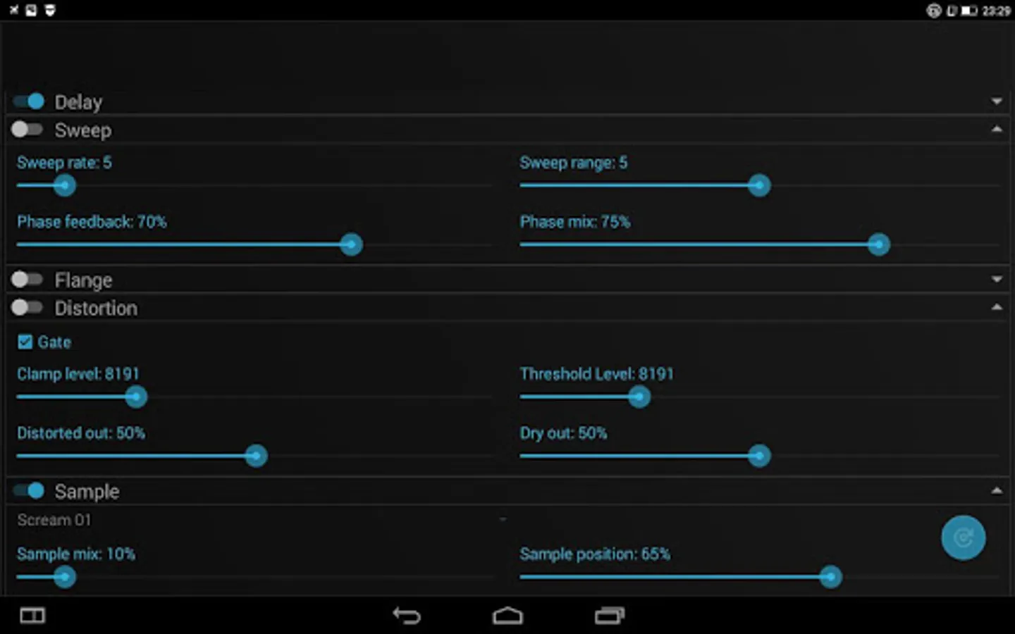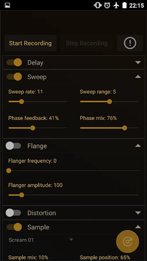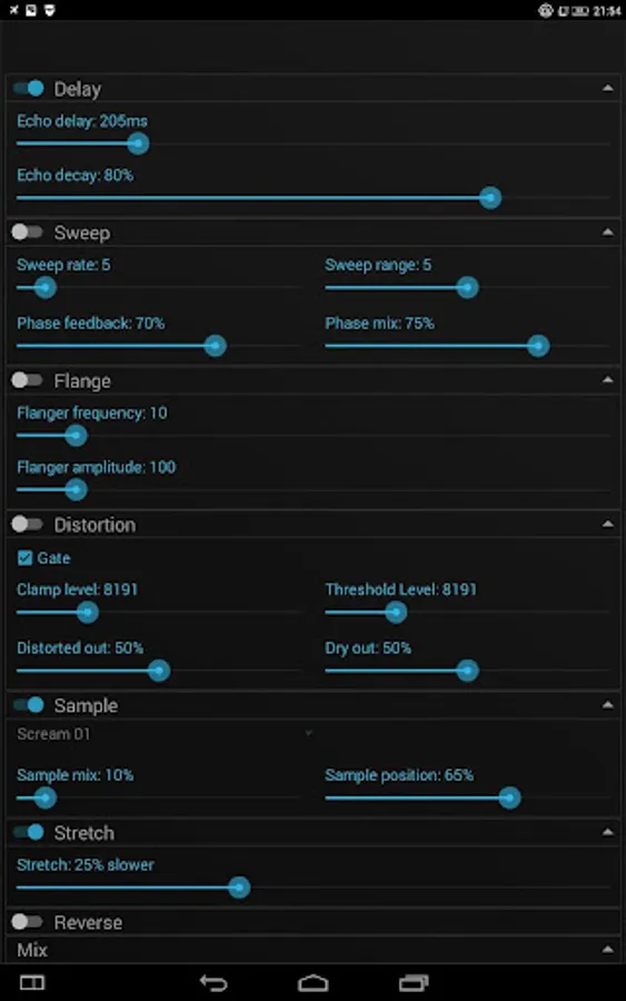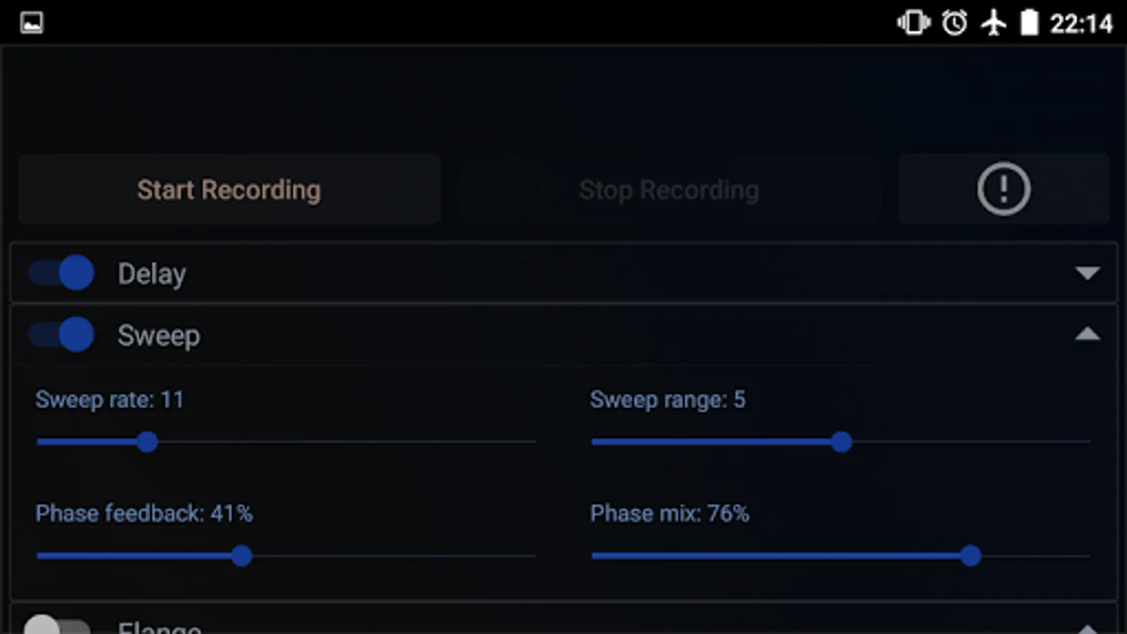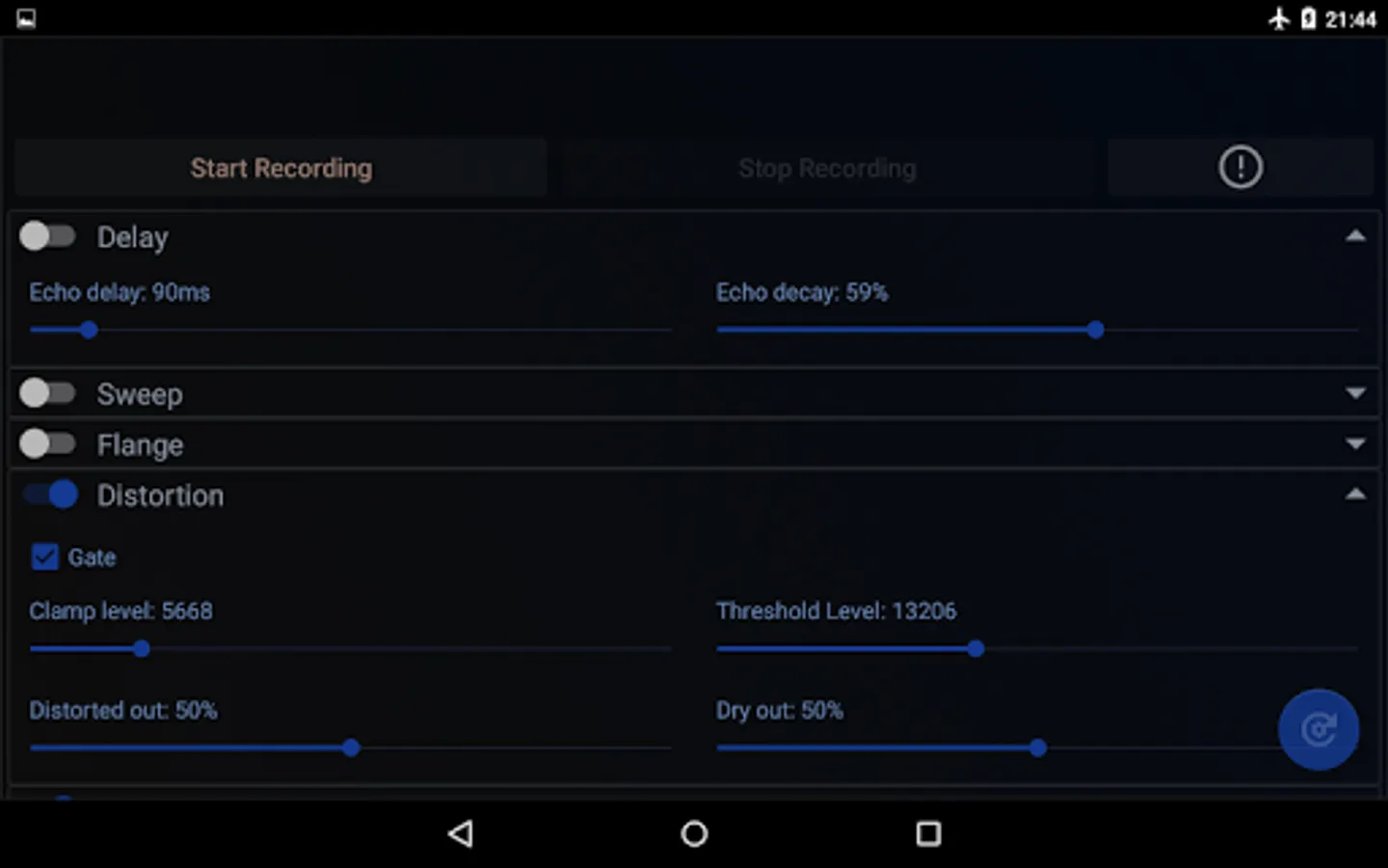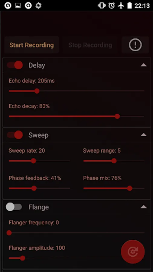 The app has default effects settings which can be changed and saved. You can also display an audio graph for the original recording and the processed file.