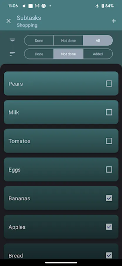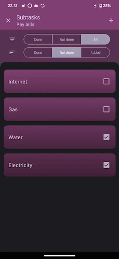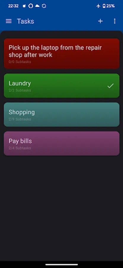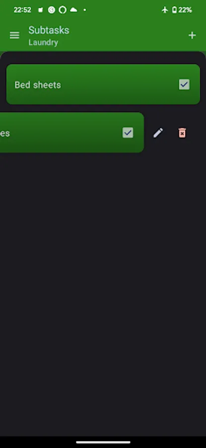 Each task can be broken into subtasks, to make it easier for you. Subtasks can be marked as done, once all subtasks are done the task is completed.
