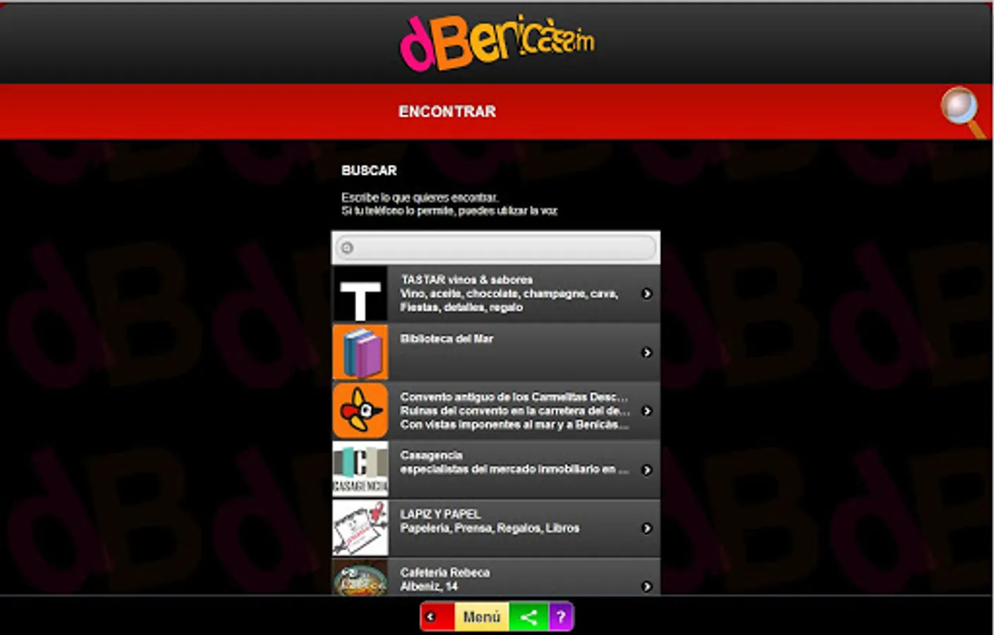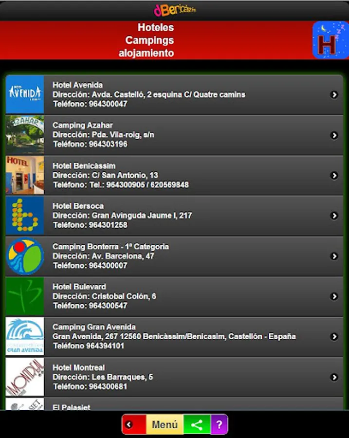 Benicàssim Guide Desk, shopping and entertainment. Leisure, Tourism, Trade, Services, Festivals, Events, Hotels, Shops, Bars, Restaurants, Activities, deals, news, weather, phone numbers, addresses. Requires very little space for installation. The information is updated at the time, via the Internet because it is a Web application (Web application). The advertiser interacts directly with the user modifying, directly and at any time, some of the information that appears on your own ad, you can publish the "menu of the day" or "next concert poster" or the "Deal of the Week ", or whatever you want to present your establishment or service. Ideal whether you live in Benicàssim like you want to spend your vacation on the beach.