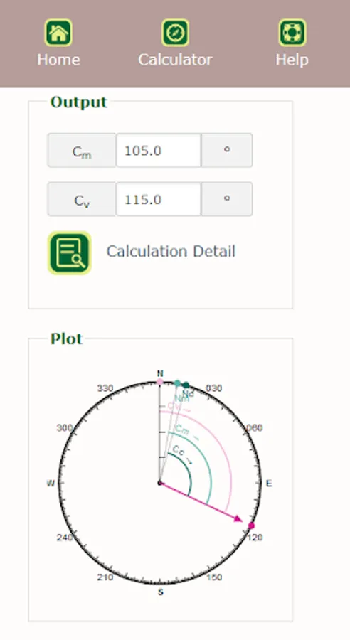 The strong point about this app is the fact that the calculation result is not simply showing the output values, but also the calculation details step by step, so that you can learn and understand what happens. Also a plot is shown explaining the difference between true north, magnetic north and compass north. Make sure you understand this well.