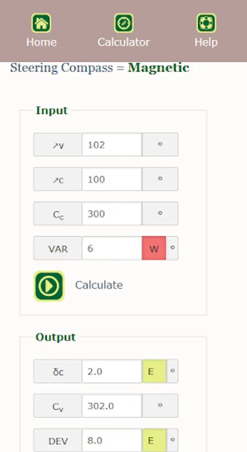 You can calculate heading relations in two directions: from compass to map and from map to compass. This can be done for magnetic compass and for gyro compass. The calculator can be used both as a learning process and in real life situations.