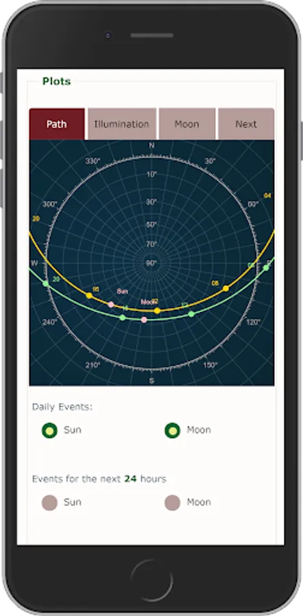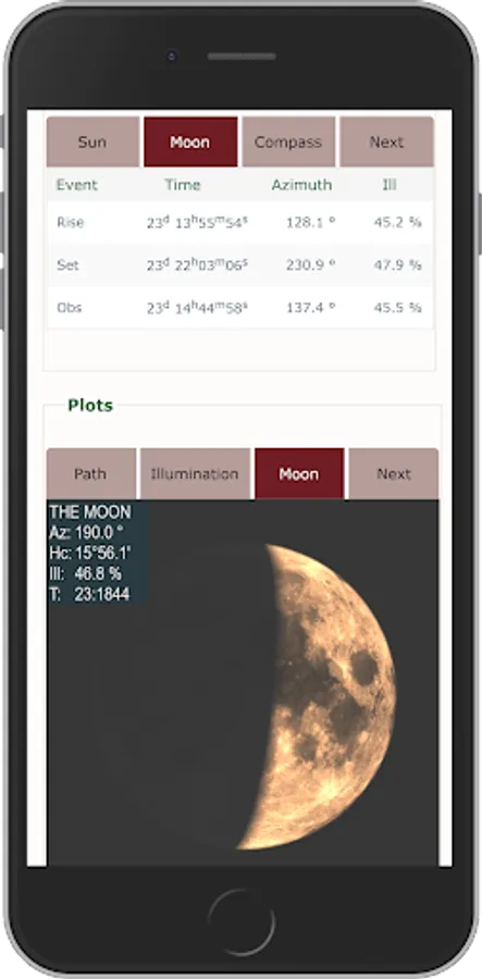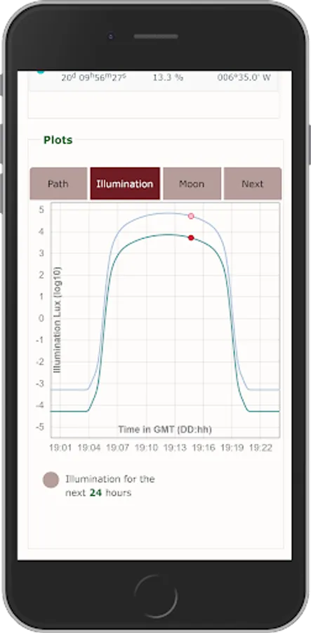 The illumination is calculated for 24 hours or the trajectory of the ship's journey (based on course and speed). The graphical representation of the results is well designed; the curves allow easy interpretation of the results. In addition, several extras are included, such as a very accurate picture of the position and lighting of the moon and the possibility of using different coordinate systems. The help pages are extensive and will guide you to fill in the parameters.