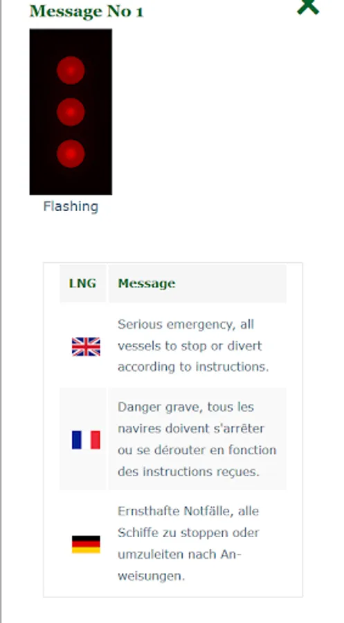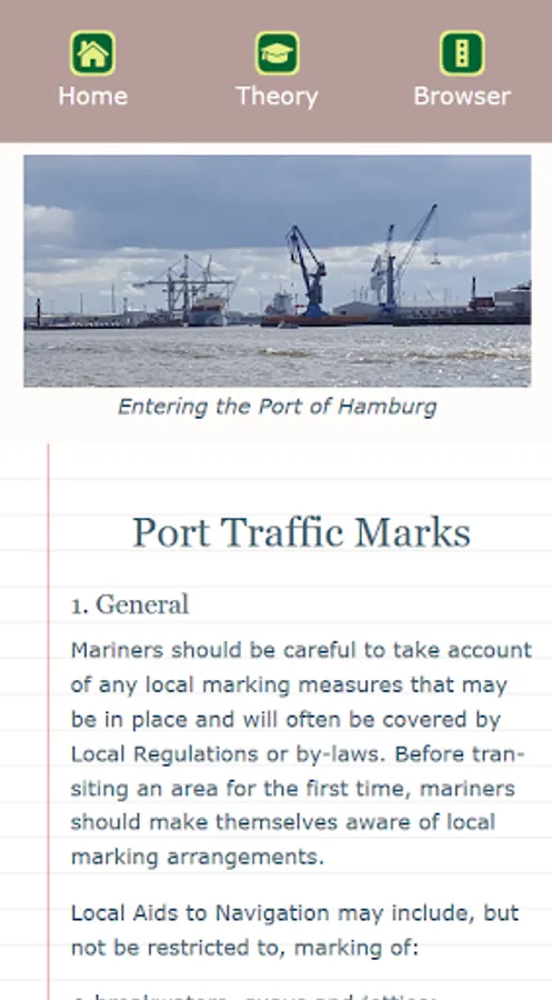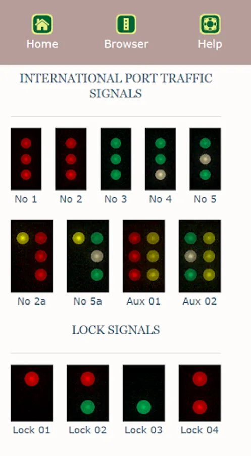This app further contains a theory section covering background information on Port Traffic Signals. We discuss the 5 rules: Main Movement message, red lights, green lights, a single yellow light and auxiliary signals. We conclude with some notes on lock signals.