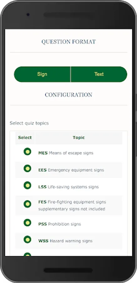 In the multiple choice quiz section you can test and further expand your knowledge in 2 directions: starting from the signs and choosing the correct explanation, or starting from the text and assigning the correct sign.