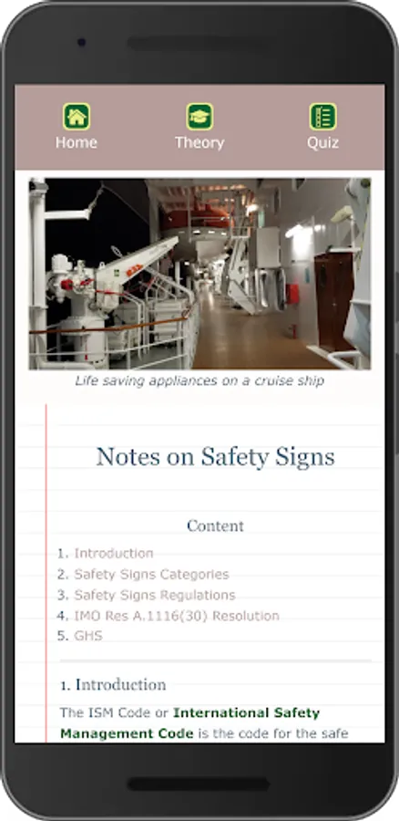 This theory section serves as a backup and makes this app a complete guide to safety signs on ships.