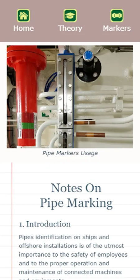 This app is all about identification of pipes and pipes medium on board of ships following the ISO 14726:2008 Standard. Knowing this Standard is of the utmost importance to the safety of all employees on board of ships and to the proper operation and maintenance of connected machines and equipment.
