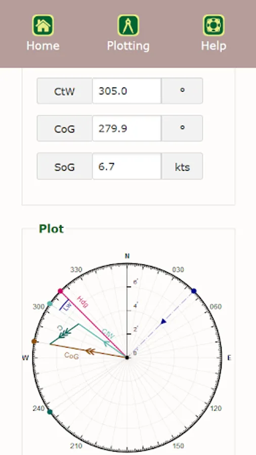 The chart plotting section treats the base problems: course to steer and course over the ground. Related topics were added like set and rate of tidal stream, interception course and wheel over point. All calculations have a graphical view, also clearly explained in the theory section.