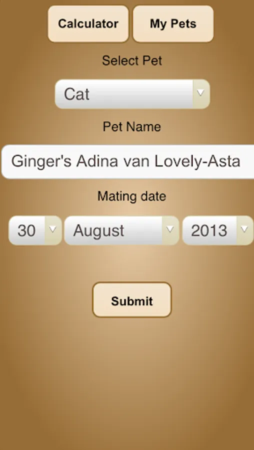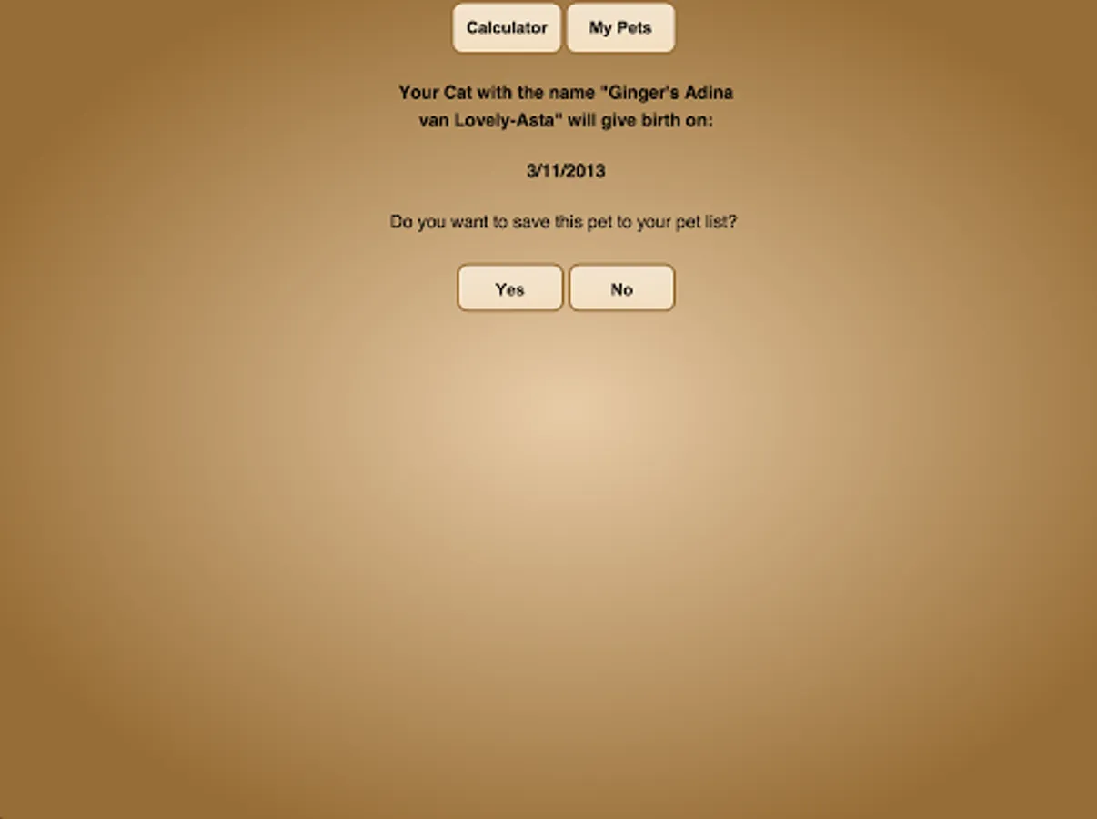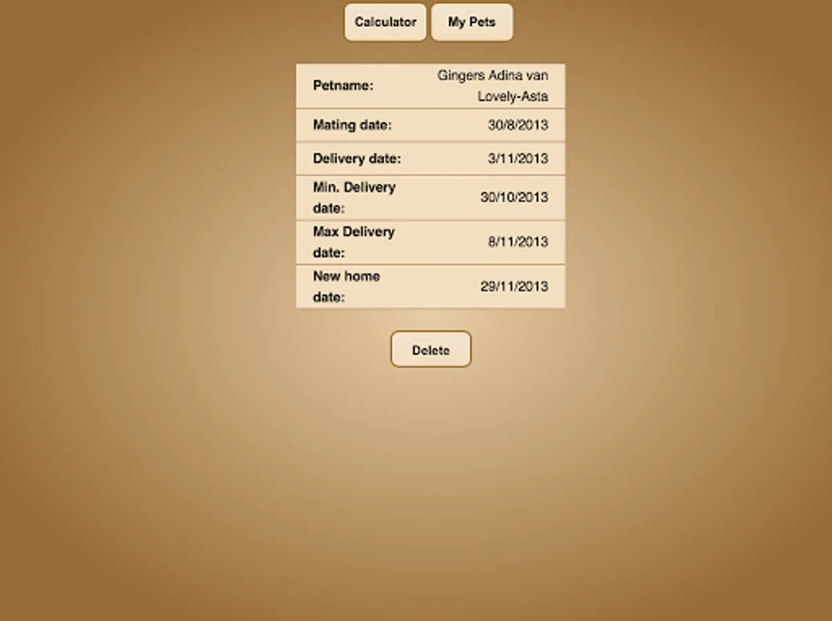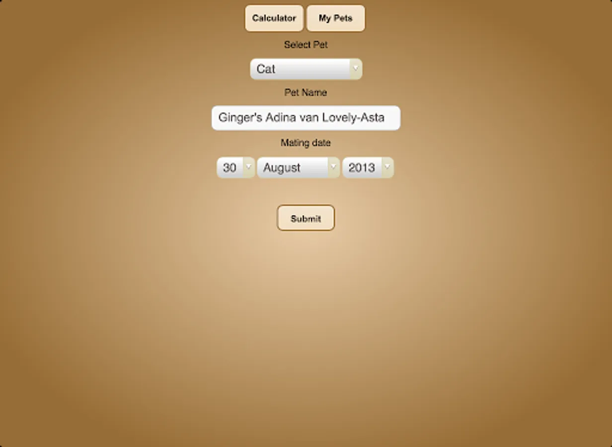 This app helps you calculate when your pet is going to deliver her youngs. You can input the mating date and the app calculates when your pet is due to deliver (within a timespan corresponding the animal kind). The app also calculates when the newly born pets can be placed in a new home.