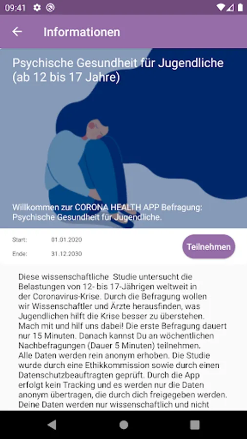 The research team of the Universities of Würzburg, Regensburg, Ulm, the Robert Koch Institute as well as the Würzburg University Hospital, the Service Center Medical Informatics of the Würzburg University Hospital, and the LA2 GmbH appreciate your participation! Note that the data is collected completely anonymously. NO TRACKING is performed by the app.