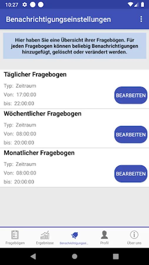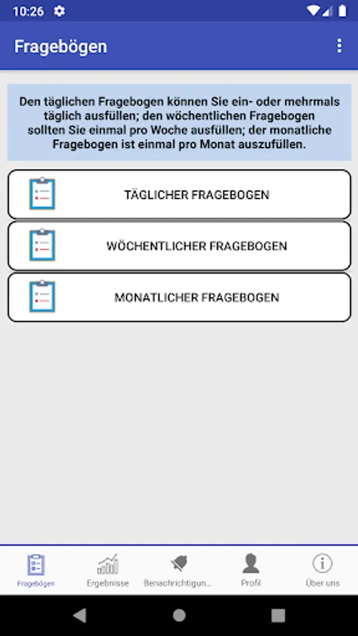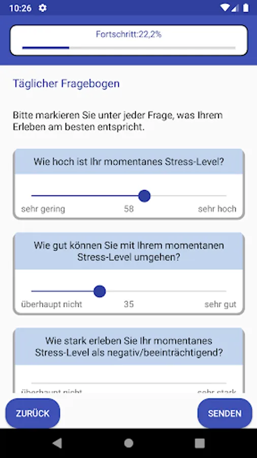 How does the stress experience change over time? Which situations in everyday life are particularly stressful? Is the experience of stress influenced by the personality? People react differently to stress and there are various factors influencing the experience of stress, such as age, family situation, gender, personality and smartphone use. Recognizing stress is important for mental and physical health. Fill out a short, scientific stress questionnaire once a day and find out more about your stress level - you will receive feedback about changes in your stress level over time as well as your personality and your stress management strategies. Your data is stored completely anonymously; it is not possible to draw any conclusions about you personally.