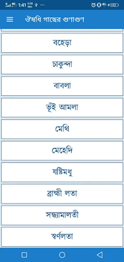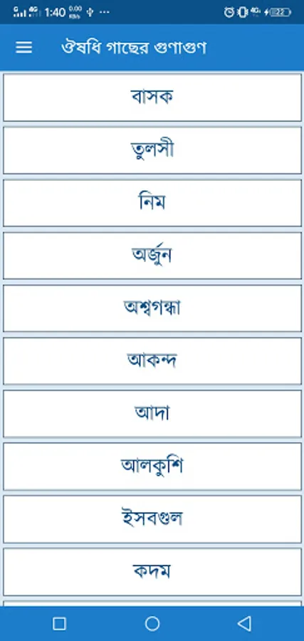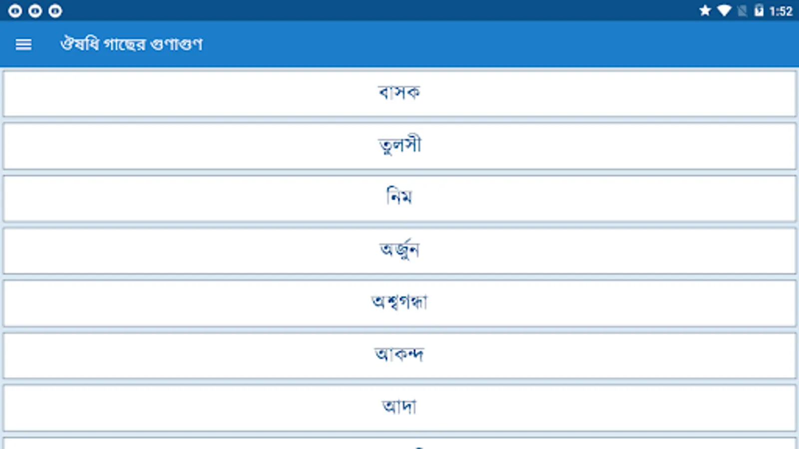 Here is a short list of all the medicinal plants available around us: Aries, Anjan, Akand, Opium, Cardamom, Kadam, Kapasia, Korbi, Kalkasunda, Jackfruit, Kakmachi, Kalmegh, Kurchi flower, Koka, Aloe vera, Chrysanthemum, Rice , Chirata, Chhitim, Chhota Akand, Jarul, Jaba, Til, Tulsi, Tamarind, Telakucha, Nayantara, Neem, Nishinda, Nilbanalata, Banmarich, Bamboo, Baobab, Bedana, Butter, Madhabilata, Rosemary, Mustard, Mango, Ginger, Amal , Ashseora, Euphorbia. Isabgul, willow, inverted chandal, serpentine, sunflower, gab, sajne, helencha.