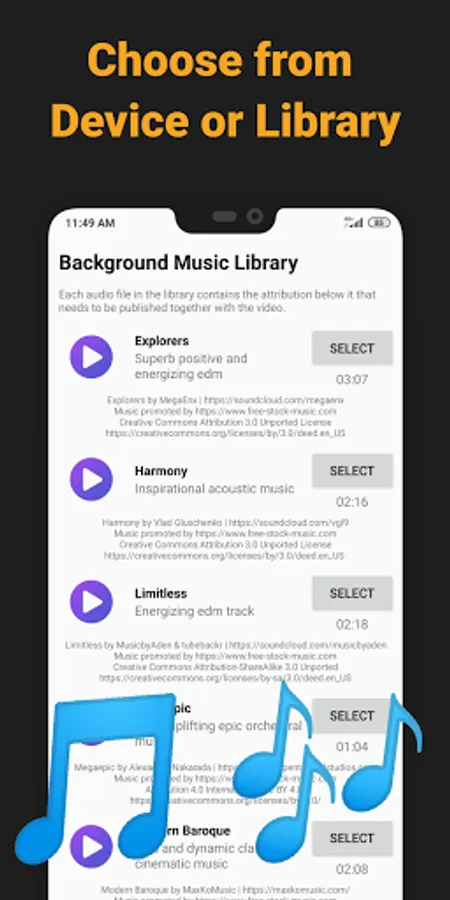 Add music to video directly from your device files or use the app's built in background music library to add background music for videos and photos!