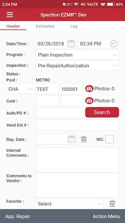 Spection DCLI Dev is an Estimate/Inspection application that allows for the inspection of trailing equipment (Chassis, Container and Trailer) for documentation of defects and repair estimates. The application includes estimate mobile print and/or email. Also includes FMCSA, M&R Vendor Audit and Take‐off Tire Inspection functionality.
