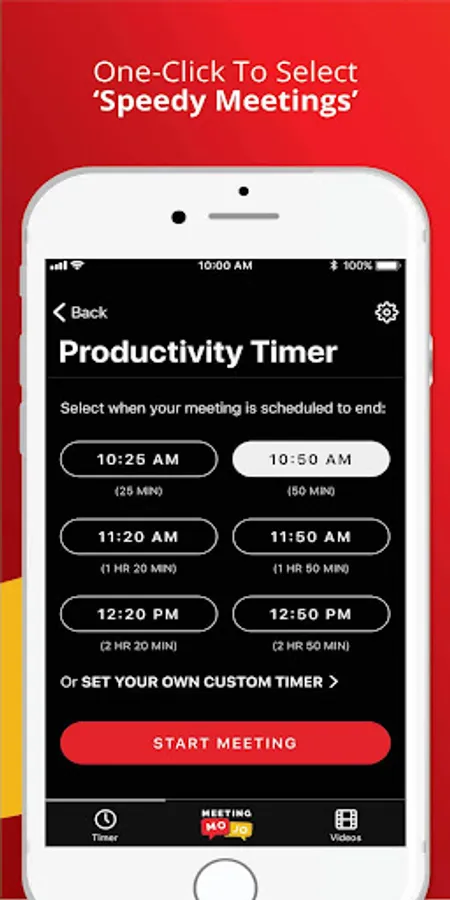 With the Meeting MOJO Productivity Timer, you can schedule speedy meetings by setting either 25- or 50-minute sessions. It means making the usual 30-minute meetings end 5 minutes early, and 1 hour or longer meetings end 10 minutes early.