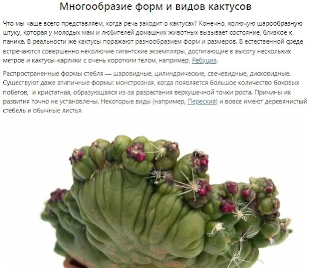 Кактусы — одни из самых распространенных комнатных растений, благодаря их неприхотливости в уходе, разнообразию форм и красивому цветению. Но мало кто знает, что в некоторых странах кактусы имеют самое широкое применение — некоторые виды выращивают как живую изгородь, защищающую посадки культурных растений от животных. В засушливых районах Южной Америки сочные кактусы используют в качестве корма для скота. Кроме того, плоды многих кактусов съедобны: их едят сырыми, готовят варенье и сладости, из листьев Перескии и молодых побегов Опунции, например, делают витаминные салаты. А экзотический «драконов фрукт» (или Питахайя) — не что иное, как плод эпифитного кактуса Гилоцереуса.