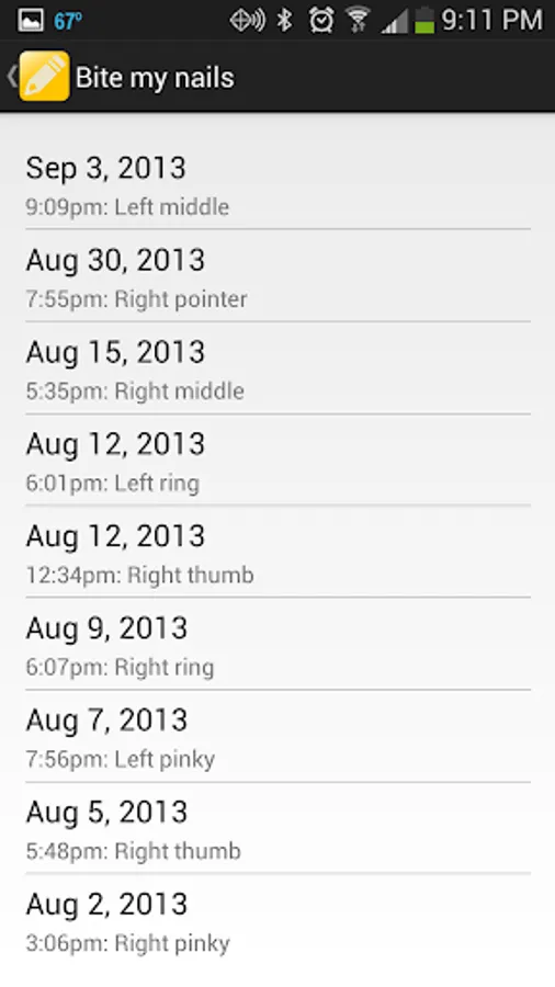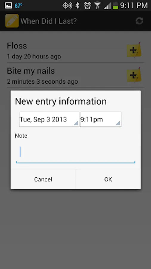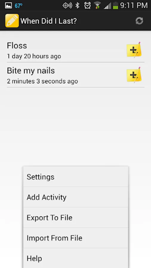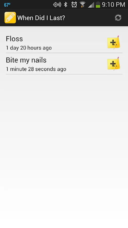 Whether you're trying to create new good habits or get rid of the bad, this app can help. We emphasize a simple, easy to use interface which will allow you to be able to easily track the frequency of any activity and know the last time you did something with the touch of a button.