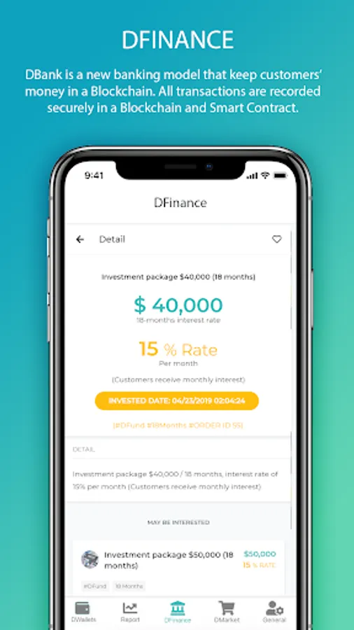 DBank is a new banking model that keep customers’ money in a Blockchain. All transactions are recorded securely in a Blockchain. Using smart contract, we can provide guaranteed interest rates, and allow customers to pick the most suitable package with the highest interest rate.