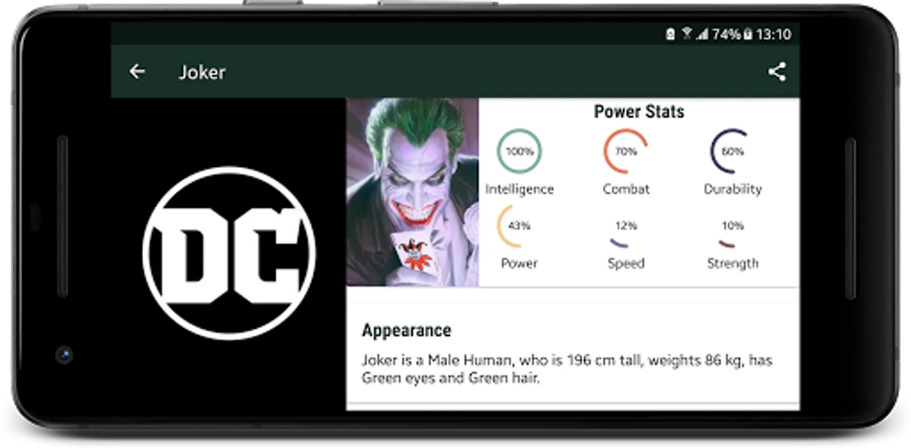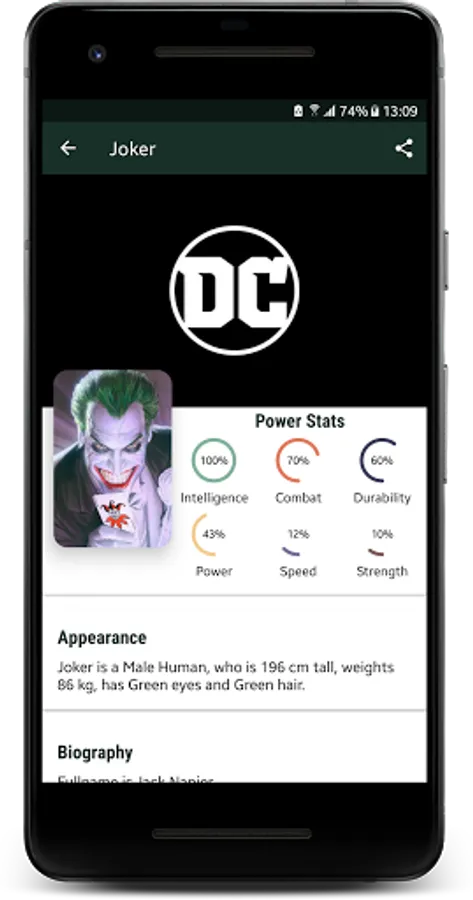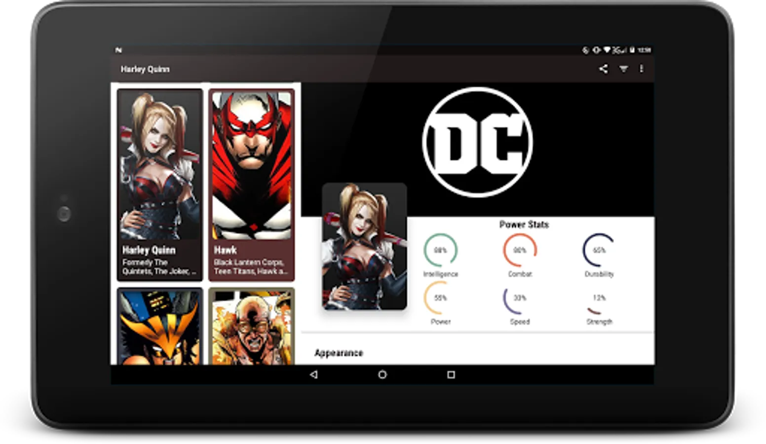 List of DC Characters ordered by Name, where you can view details of a certain character including appearance, power stats, biography, and affiliations.
