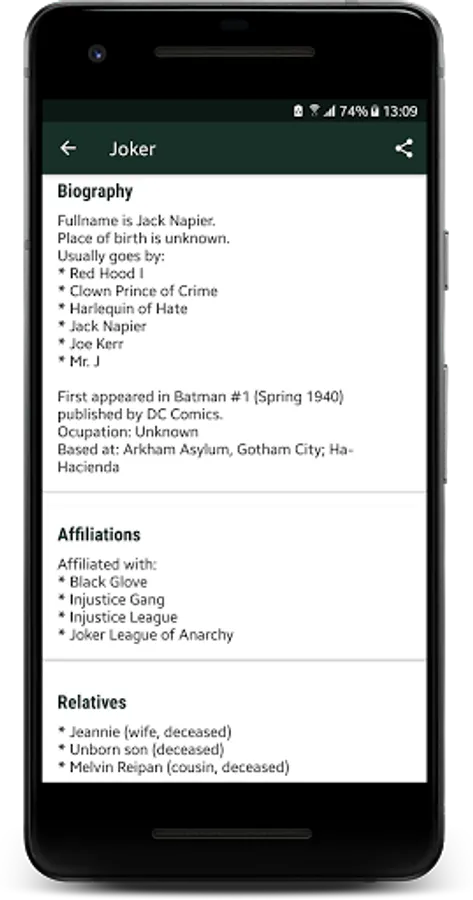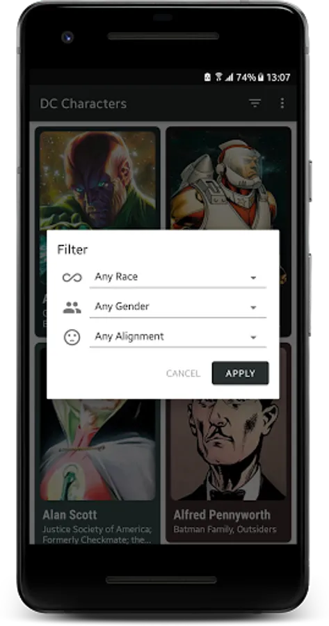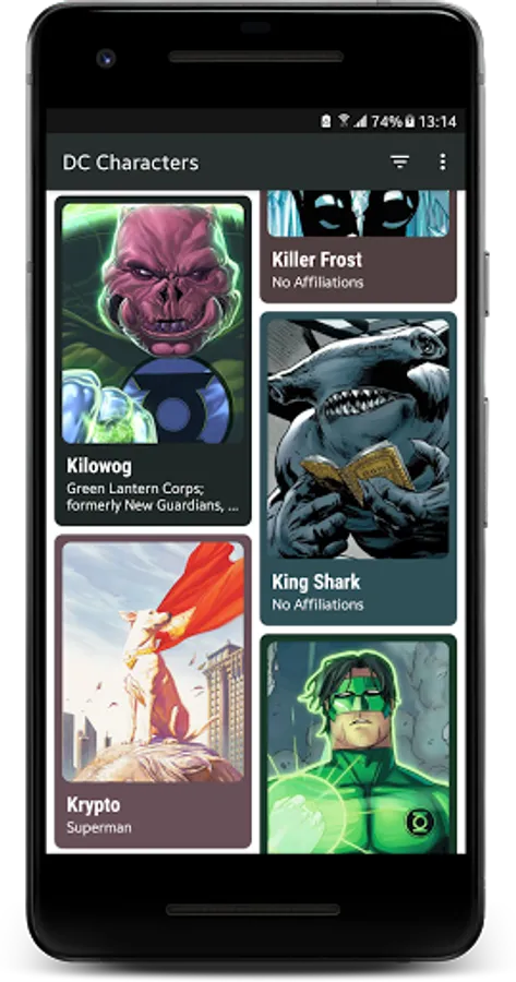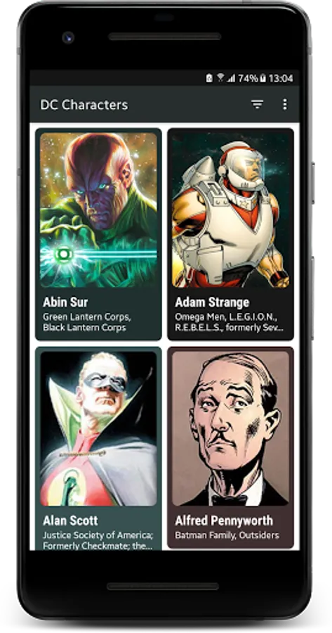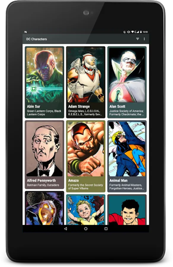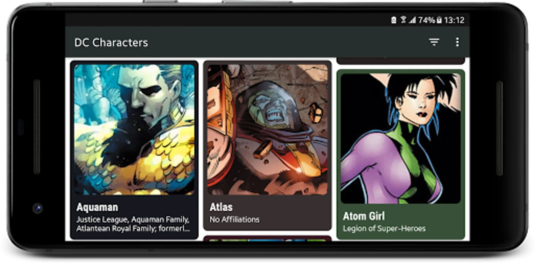 List of DC Characters ordered by Name, where you can view details of a certain character including appearance, power stats, biography, and affiliations.