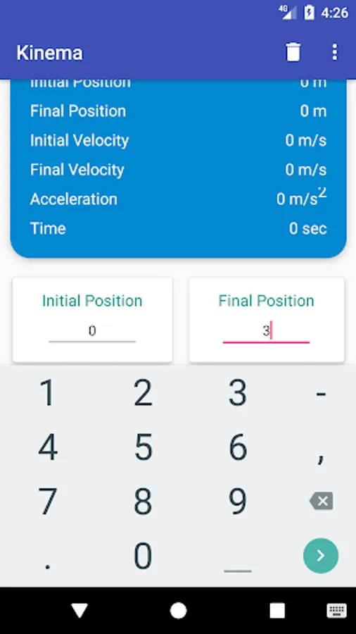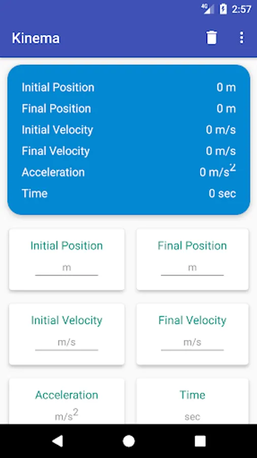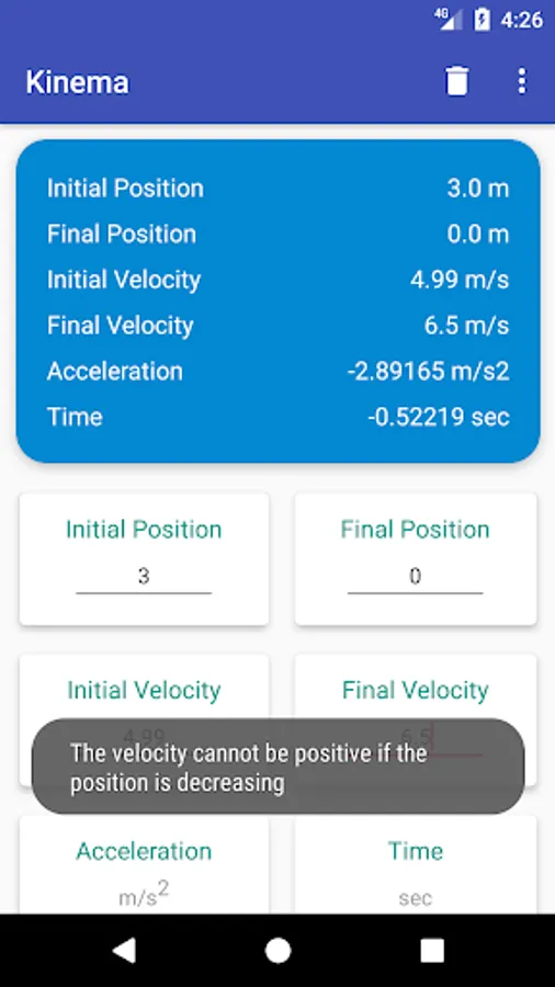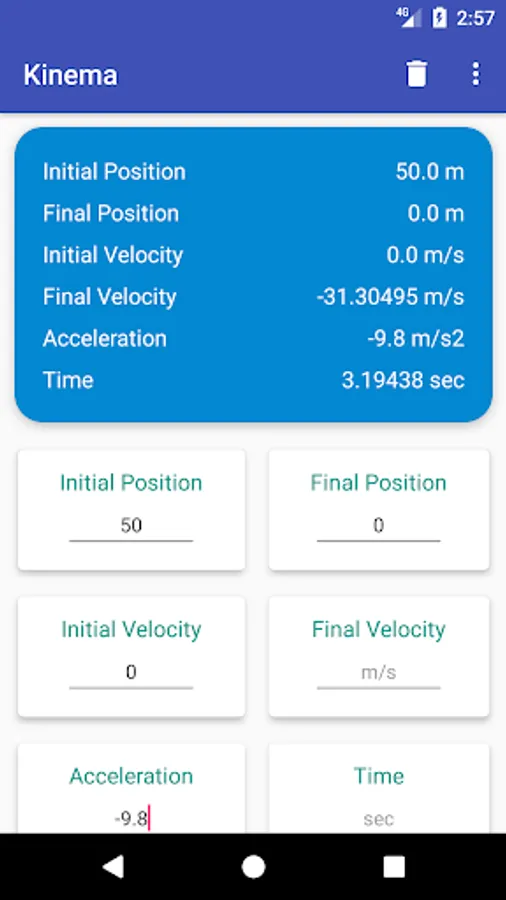 Solving kinematics problems can be tedious. You need to find the proper equation, calculate the missing value, and find the proper equation again to solve the next missing value. This app will do the entire process for you instantly. Just plug in all the known values and the app will calculate the rest.