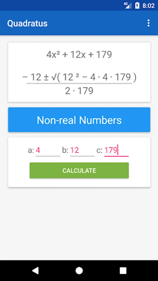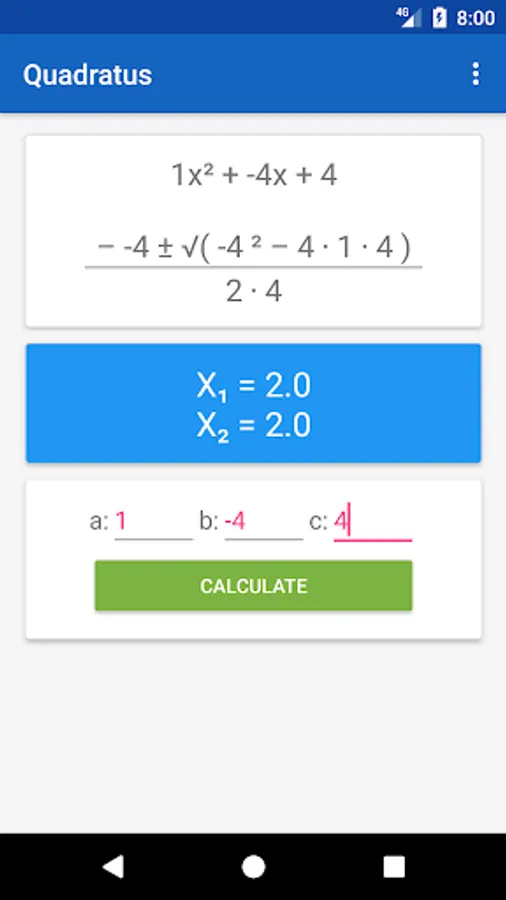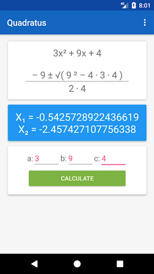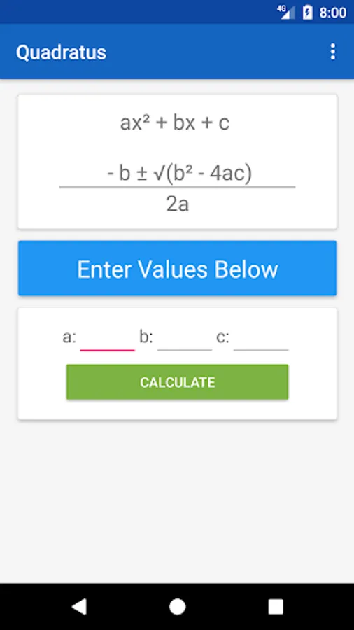 Having trouble remembering the quadratic formula? Do you take a lot of time finding the roots? Save some time and take advantage of this simple free app as it calculates the roots of a quadratic equation for you.