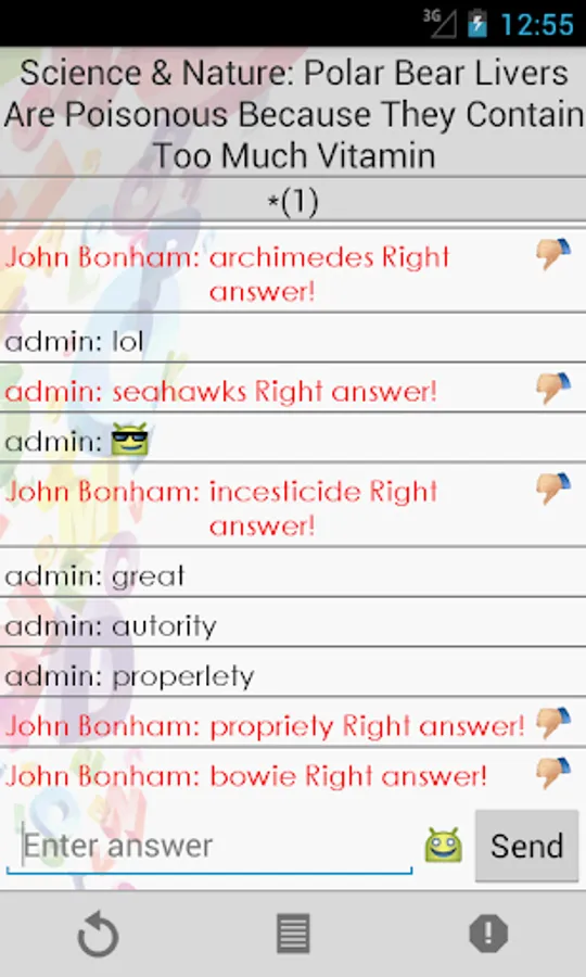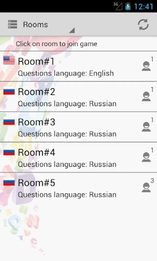 The Players are divided by rooms. There are special rooms for playing in English. Players get a question and try to answer it correctly . If the needed answer isn't done during the first period, the players get a hint. The first hint - the number of letters in answer. Then the letters one by one will be opened .Once the players give 15 correct answers, the number of points will be counted. The player with the most points wins. If two or more players score the same, then the game continues until determine the winner.