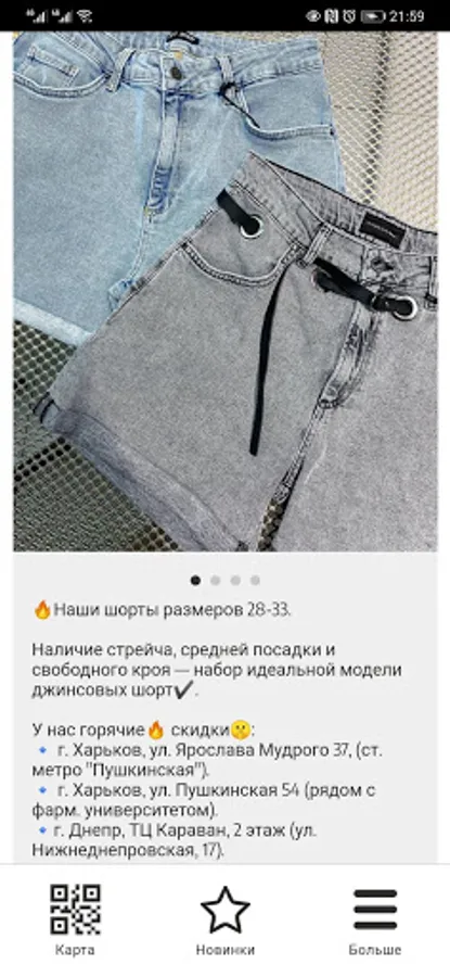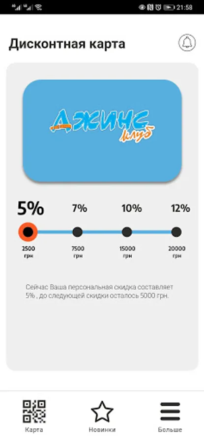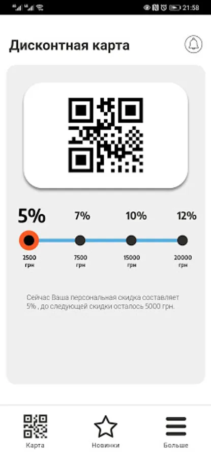 In the application you will find photos of new products, information about stores. The discount card will be saved in your phone and you will not forget it at home. You will be able to see your current discount on the Discount card and the amount left to skim to increase the discount.