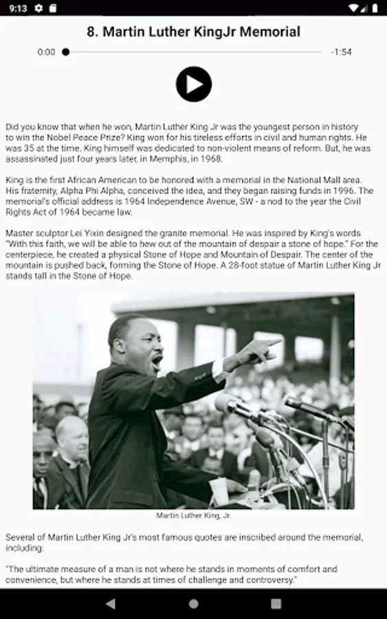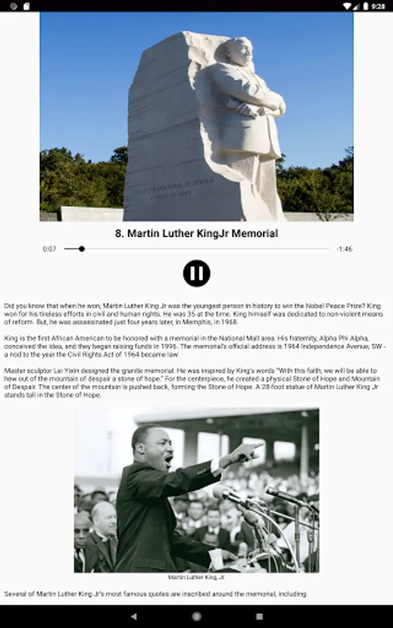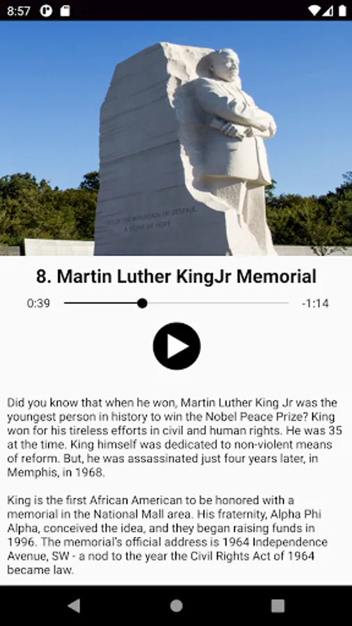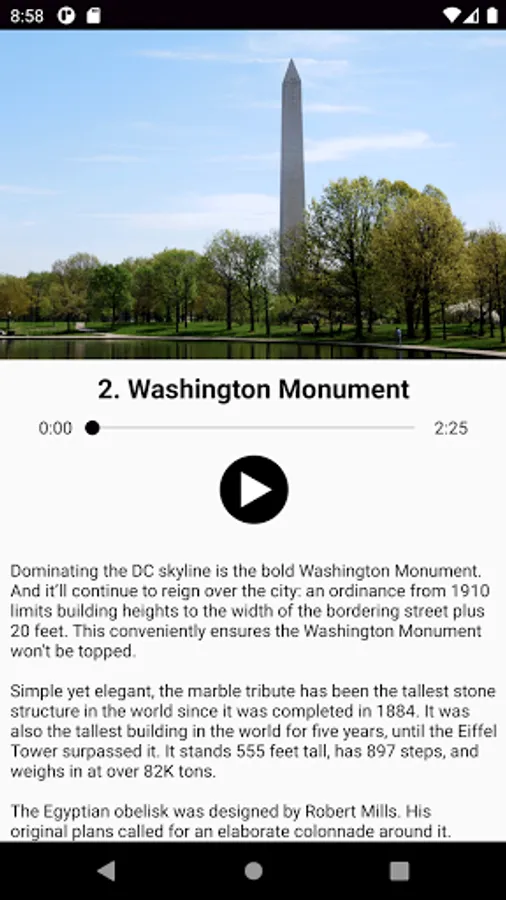 The best audio tour of Washington DC around! Our narrated guide to the National Mall has all the best parts of a guided tour, while allowing you to travel at your own pace, avoid crowds, and explore. Why strain your eyes to see a distant statue from a tour bus, or get rushed through your favorite site? See DC the way it was meant to be seen: on foot. The National Mall's park-like setting was designed for walking.