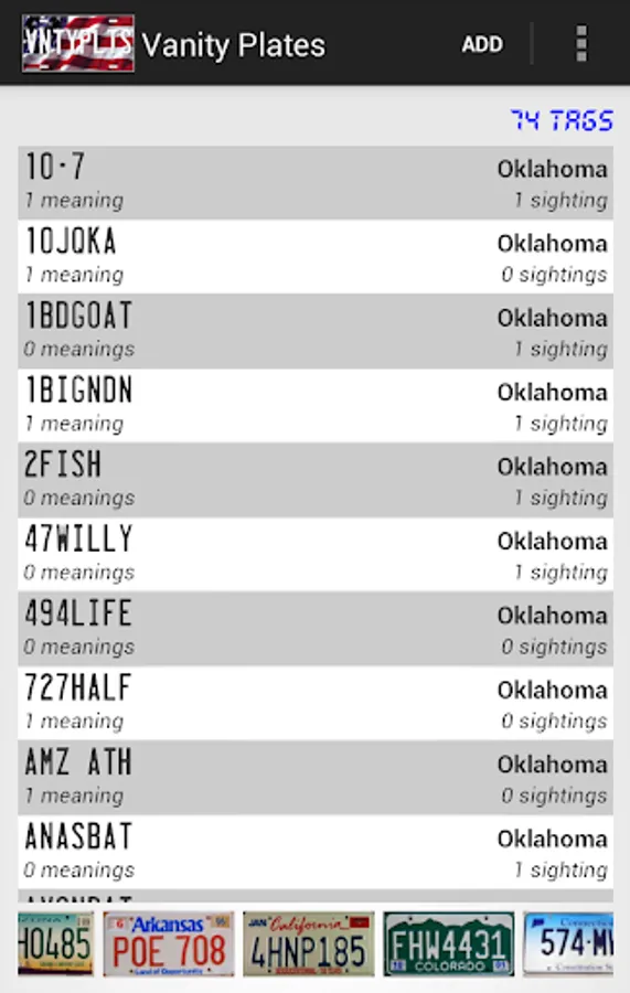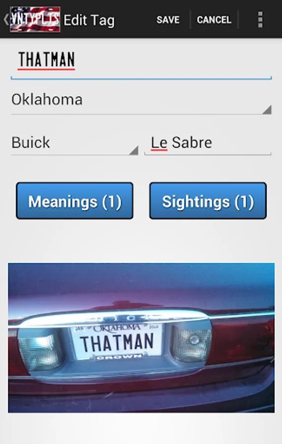 We see them all the time while driving down the road, or just sitting in a parking lot. Personalized (i.e., vanity) tags adorn thousands of vehicles across the country. It's impressive what a person can think of (to describe one's self or car) when limited to just a few characters. This handy little app will allow you to keep track of them. You can record the tag itself (including a picture), the make/model of the vehicle that you saw it on, what you think it means, and the date/location of when you saw it.