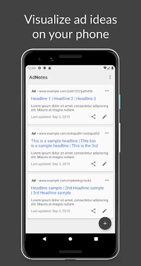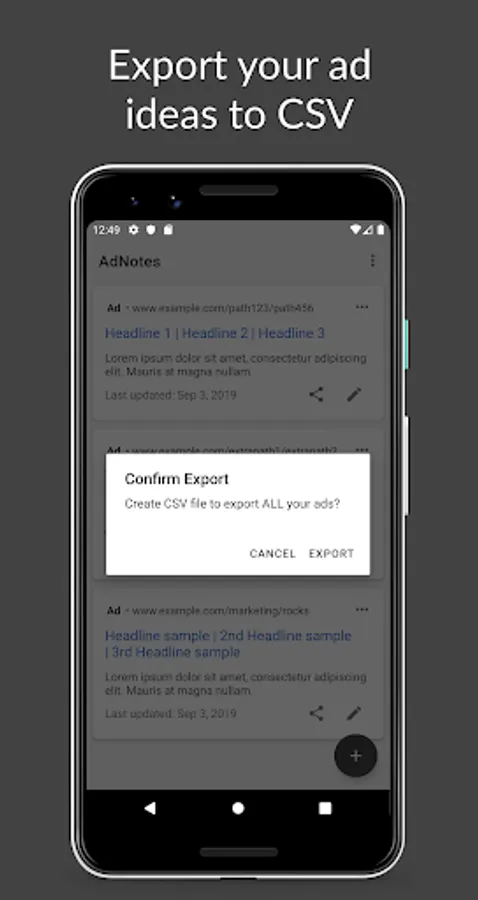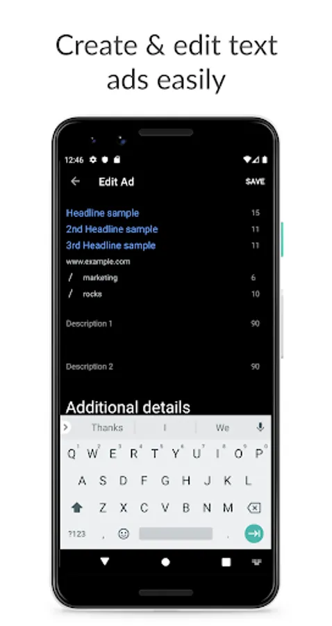 AdNotes is a digital marketing app to create text ads from your mobile phone in the form of expanded text ads. Includes FREE export & dark theme.