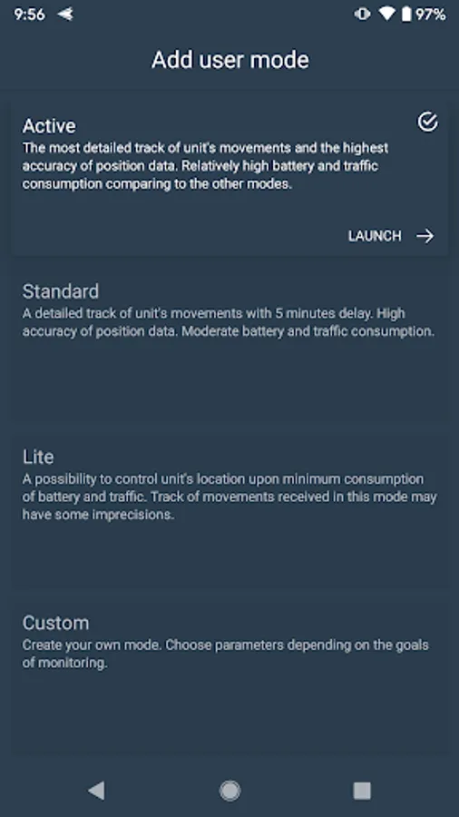 The application supports choosing a user mode from preset ones or creating your own with settings depending on the goals of monitoring. A wide range of settings available allows receiving accurate data while reducing traffic and battery consumption.