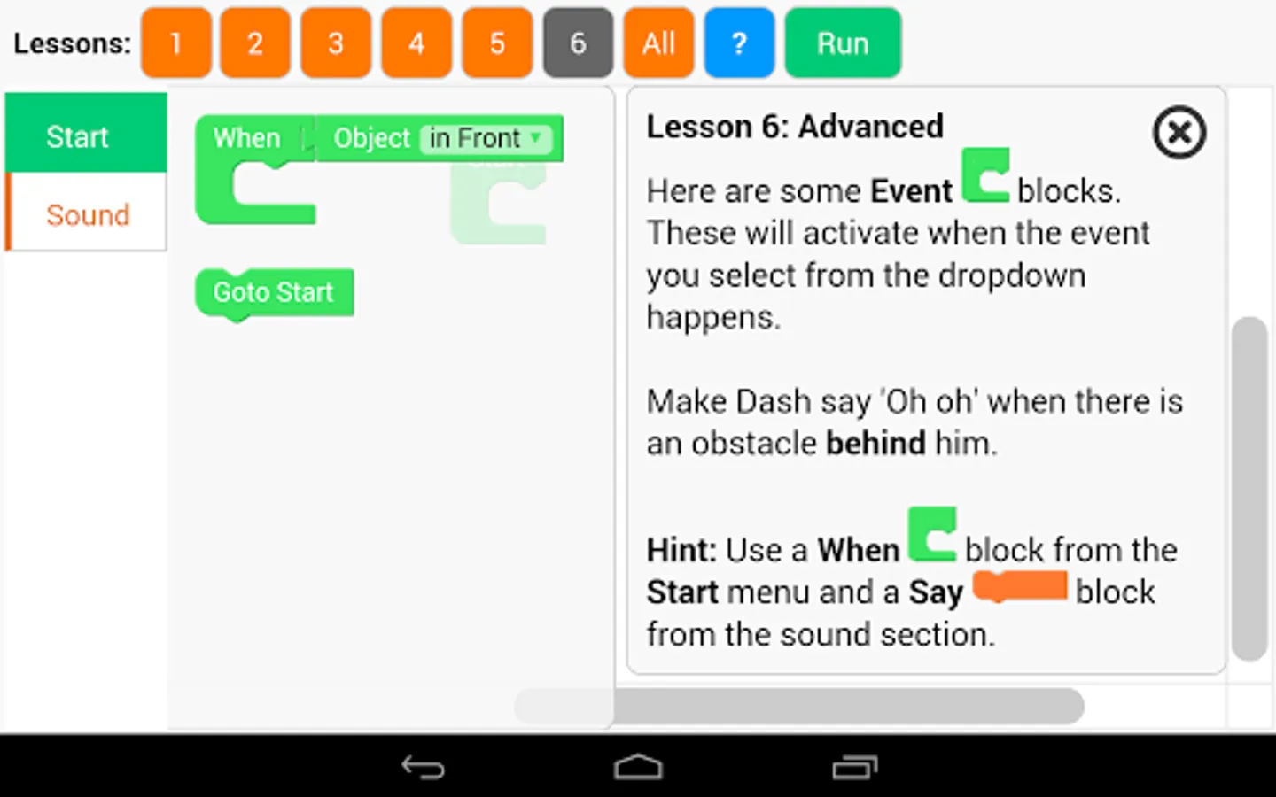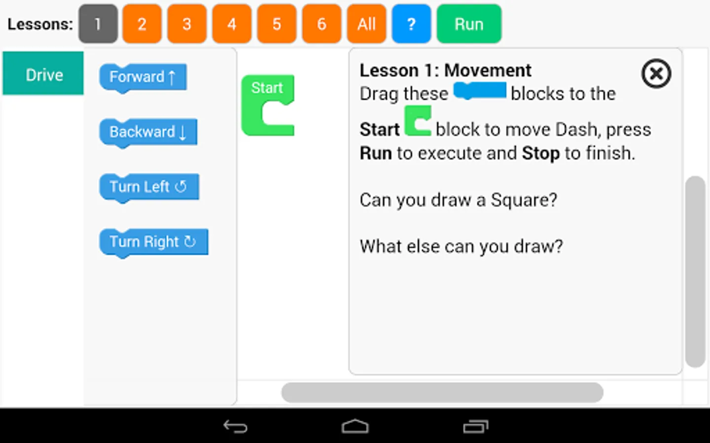 This is a simplified version of the "Blocklify" App especially targeted at younger owners of Dash and Dot. The blocks have fewer options and there are 7 lessons that introduce what each block does.