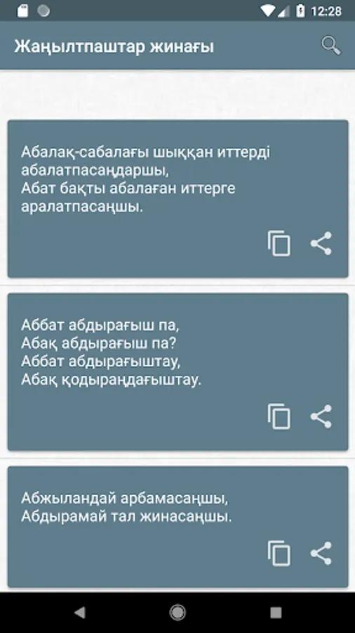 Kazakh language - the national language of the Kazakh people, belongs to the Turkic group of languages. Here you will find a variety of tongue twisters in Kazakh to improve diction alphabetically.