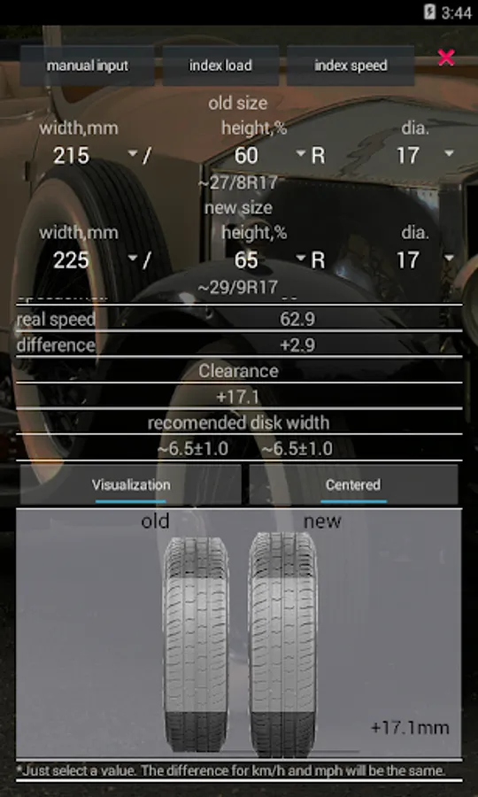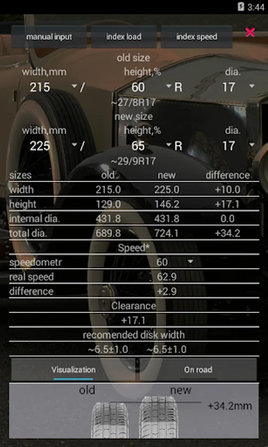 Tire size calculator. Calculates general data - tire width / height, speed difference and ground clearance. Metric and imperial sizes.
