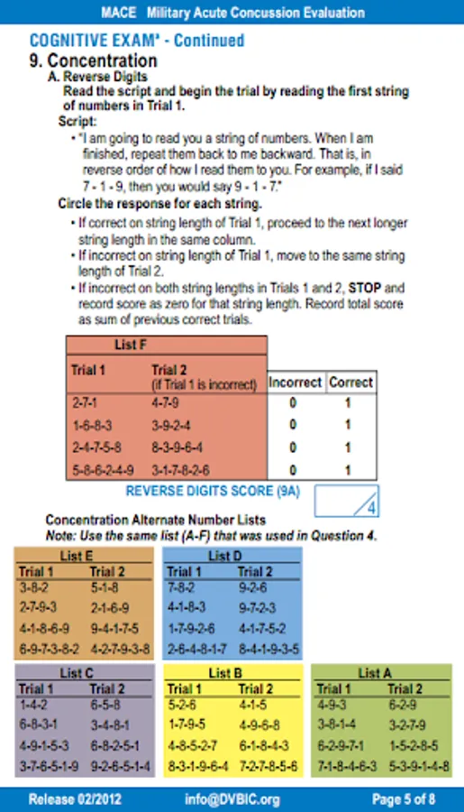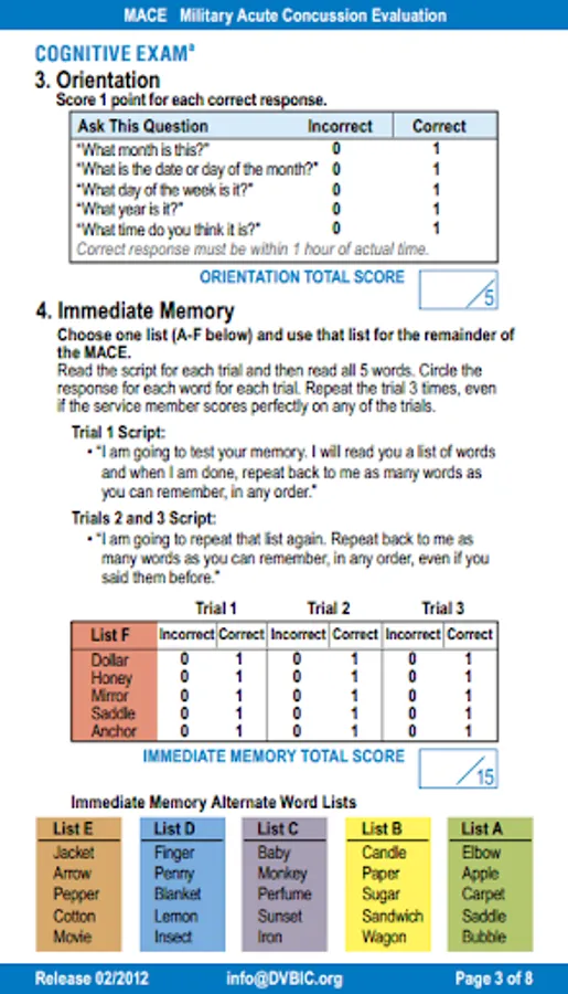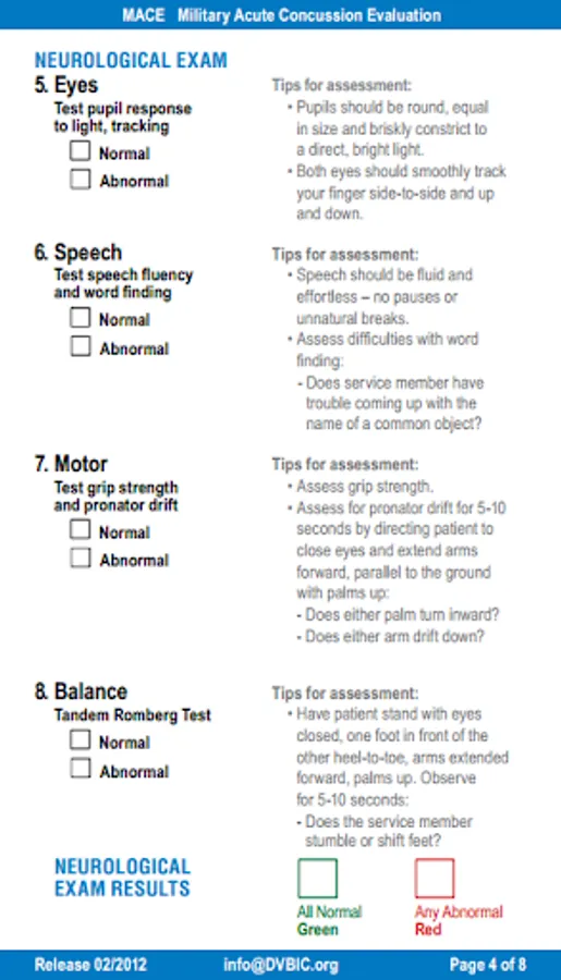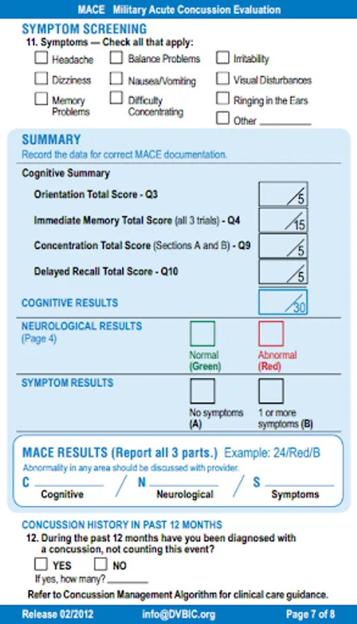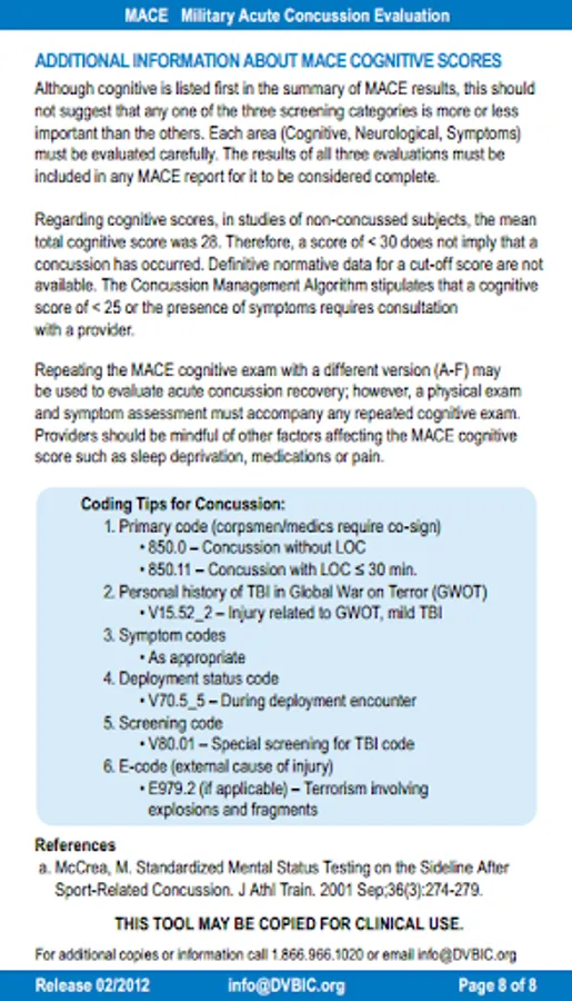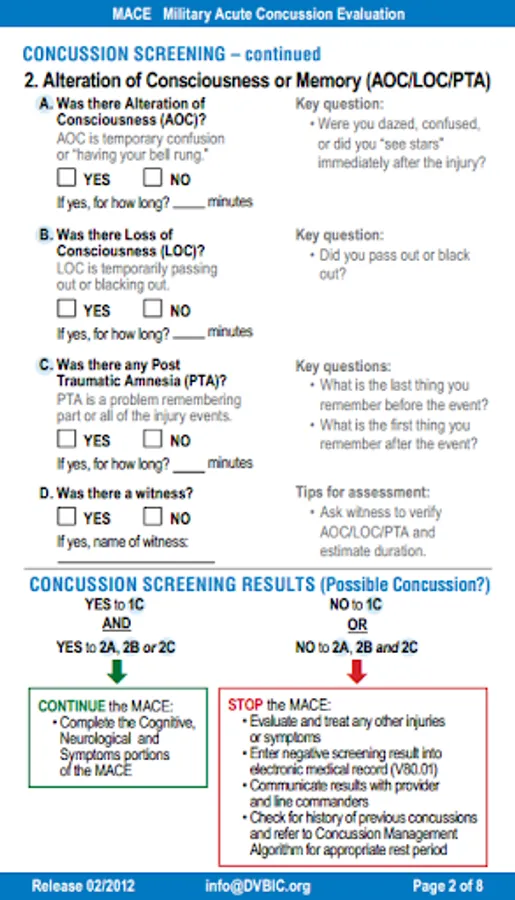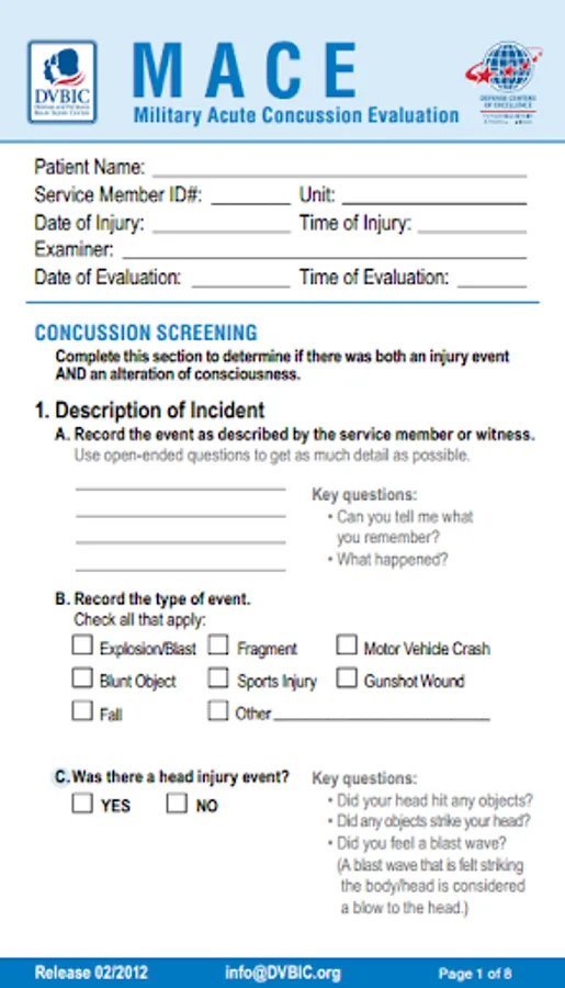 The Military Acute Concussion Evaluation (MACE) is a concussion screening tool for the acute assessment of service members involved in a potentially concussive event.
