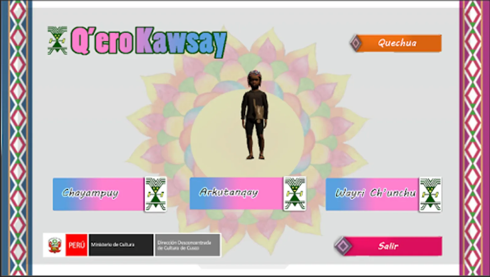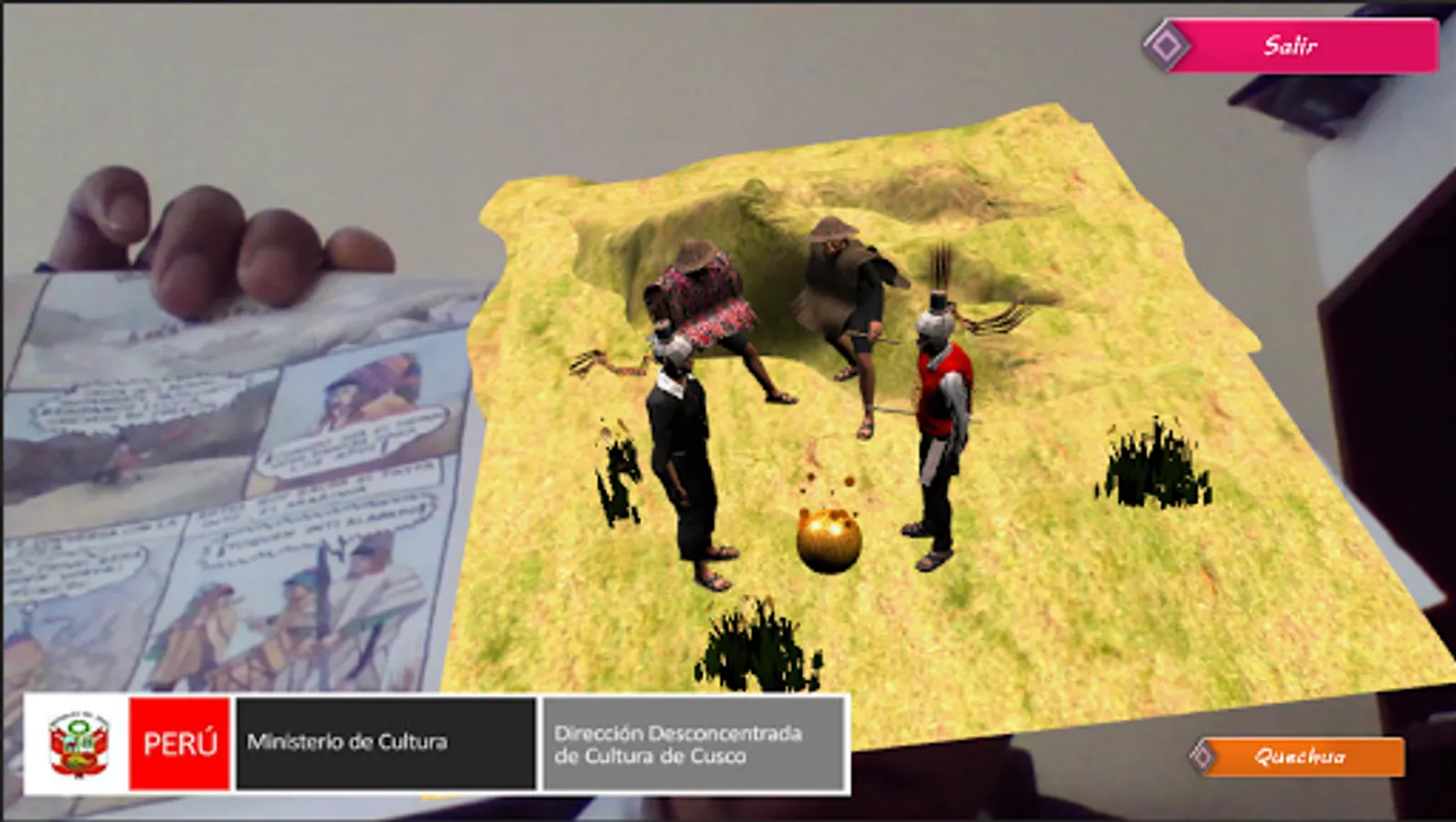 It is an augmented reality application that complements the contents provided in the comic book “Wayri Ch'unchu” (Printed material made by the DDC available on its website) that invites users to look for complementary information in the cartoon by exploring with the cell phone camera of the main images found in the cartoon. This application has basically been divided into 4 modules: