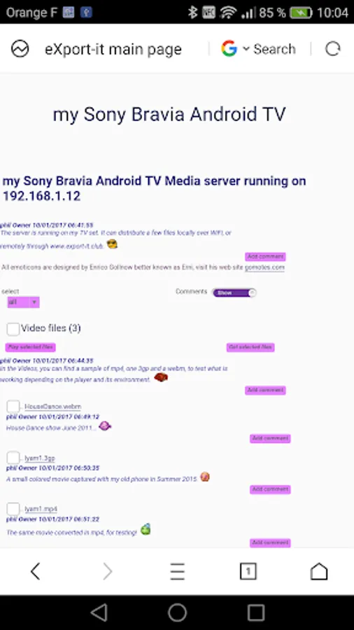 When using a Web browser as client you can write comments with emoticons everywhere in the page. Only the writer of a comment and the administrators can delete it. The files can be set in a categories to be distributed in shorter lists to some specific users. You can give details on your photos ,videos, ... in comments, and the users can write what they think about it.