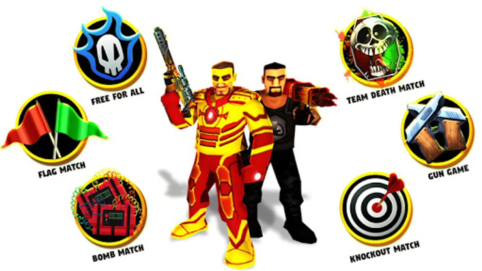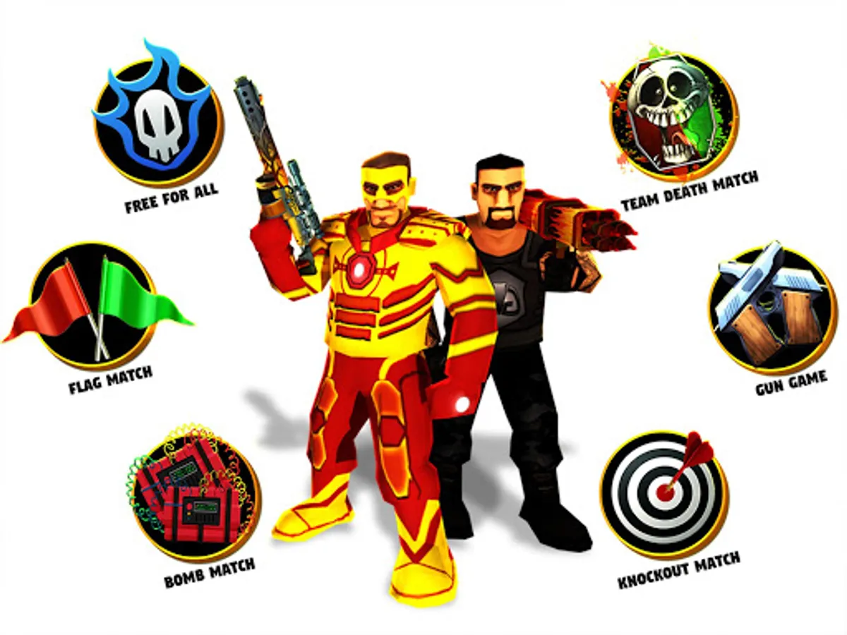 Team Death Match, Free For All, Flag Mode, Gun Mode, Knock Out Mode & Bomb Mode.