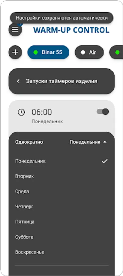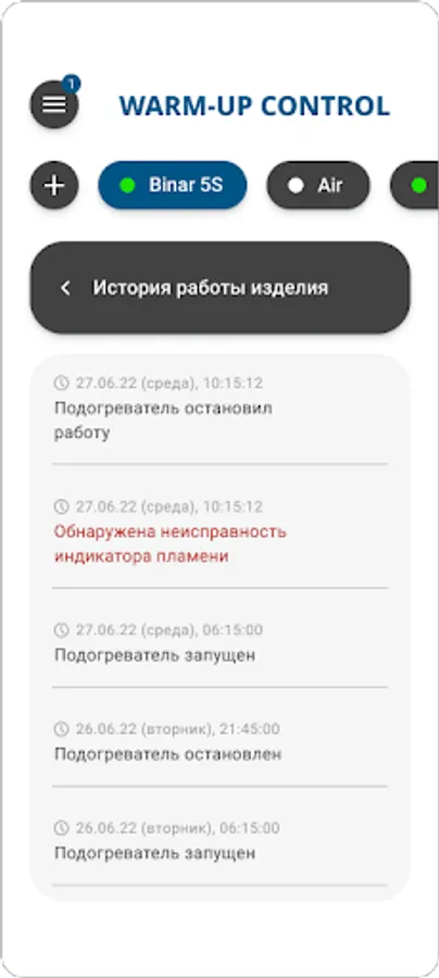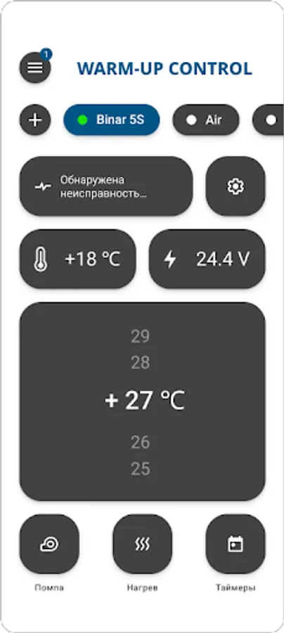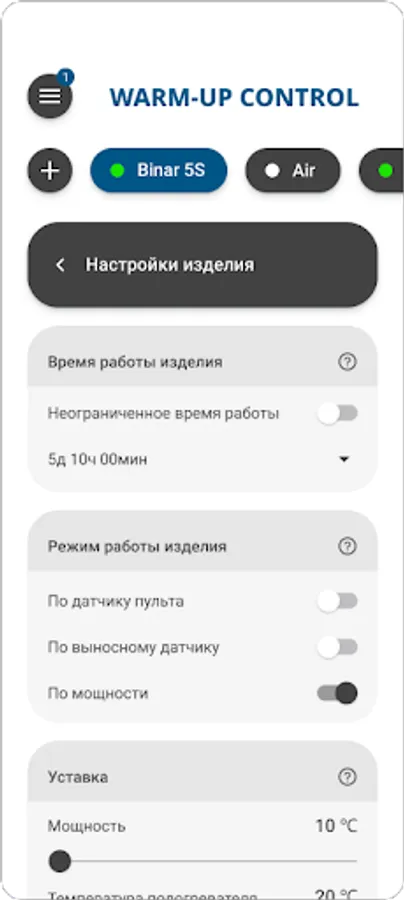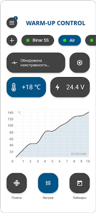 The Warm-Up Control application is designed for remote control of Binar 5S, 14TC-10 (February 23), 14TC-mini (May 23) and Planar 2, Planar 4, Planar-44 air heaters.